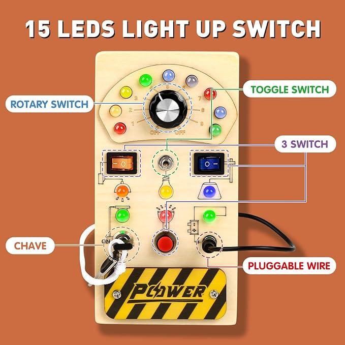 ■商品説明【ビジーボード 知育玩具 1 2 3 4 歳】 このビジーボードには、15個のライトと7つのスイッチが付属しています。各スイッチは異なる色のLEDに対応しています。スイッチには、鍵が1つ、ボタンが3つ、ロータリースイッチが1つ、プラグ可能ワイヤーが1つ、トグルスイッチが1つあります。これは、子供のための最高の早期教育開発玩具です。注意:2つのAAA電池が必要です(含まれていません)。 【モンテッソーリ玩具 男の子 女の子】 このモンテッソーリ玩具は、子供たちが遊びを通して学ぶことを可能にします。幼児はこのビジーボードを使用して、さまざまな色を認識できます。手と目の協調性、細かい運動技能と論理的思考をを高めることができます。また、この玩具は外出先への持ち運びにも最適なサイズです。 家でも、飛行機の中でも、車の中でも、旅行中でも使えます。 【幼児向けのハンドルおもちゃ】 私たちのビジーボードは、幼児の小さな手に適しており、多くのスイッチとLEDライトが付いており、お子様が常に集中できるよう、様々な遊び方ができます。私たちの木のおもちゃは、他のおもちゃより丈夫で耐久性があり、壊れにくくなっています。 【安全な素材の木のおもちゃ】私たちの知育玩具のすべての部品は完全に研磨され、クリアされた天然木で作られており、子供にとって安全です。化学薬品や塗装は一切使用しておりません。エッジは滑らかで、子様を傷つけることはありません。 【人気の1 2 3 4 歳 知育玩具プレゼント】 ビジーボードは1 2 3 4歳の男の子と女の子のための優れた早期教育発達玩具です。この木のおもちゃは、子供たちがおもちゃに集中し、楽しむことができます。子供の知育玩具やプレゼントとして最適です。?もっと見る
