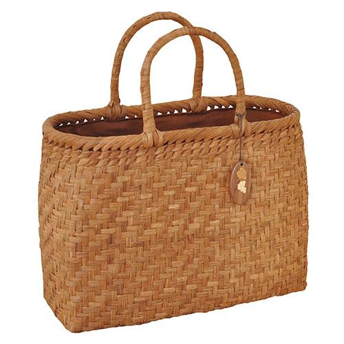 やまぶどうの蔓を裂いた樹皮をテープ状に開き、丁寧に編み上げた手づくりのバッグです。使いやすく、飽きのこないシンプルなデザイン。和服だけでなく洋服にもしっくりとなじみ、普段の装いがグッとおしゃれになるバックのシリーズです。☆中身をカバーする被せ布が内布と一体になっており、便利です。(取外しはできません) 内布にはオープンポケットが2箇所付いています。内布は、籠と直接荷物が触れないように優しく包む役割もあります。☆職人が丁寧に編んでいます。☆オーソドックスな形状で定番的な製品。はじめての方にも安心してお勧めできます。☆使い込むほどに艶や味が出て、手放せなくなります。☆山ぶどうをデザインした木のオーナメント付。【年を追うごとに深まる味わい】購入時から徐々に育てていく楽しみ。長年ユーザーさんと時間を共にしたバッグはなんとも言えない艶に輝いてきてしなやかさも合わせ持ち、手放せないものになります。自然の恵み、職人の粋を何年もかけて自分だけの風合いに育てられるのが山葡萄籠です。【ご注意】雨などに濡れたらすぐに乾拭きをして、風通しの良い日陰で十分風を通してください。ドライヤーや直射日光など熱源をあてることは厳禁です。また、高温の車内に放置するとダメージは大きく色むらもおきますのでご注意ください。特にご購入後 日が浅いうちは籠にしなやかさもなく、ひごが割れやすいので注意が必要です。ご使用にならない時も、涼しく風通しのよい室内に置き埃やカビなどに注意しながら、毎日なでてあげると良いでしょう。※手づくり品のため、表情や重量は若干の個体差があります。