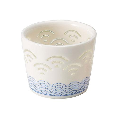 光を通して模様が浮かび上がる「蛍手」を施した、シンプルでかわいらしい器。同柄の小紋柄を挿し色であしらい、趣きある表情をつくりました。柄には、日本古来の文様で和モダンなイメージを演出しました。蛍手の模様の透かしで上品さと、中の食材の気配も楽しめます。薬味・珍味・オードブル、ソースやドレッシング入れ、食後のプチスイーツ用などにも最適です。モーニングやランチセットの器、ビュッフェ、ホームパーティー用にもどうぞ。◆蛍手◆透彫(すかしぼり)にしたのち、透明の釉薬をその小穴に充填して焼成する技法。