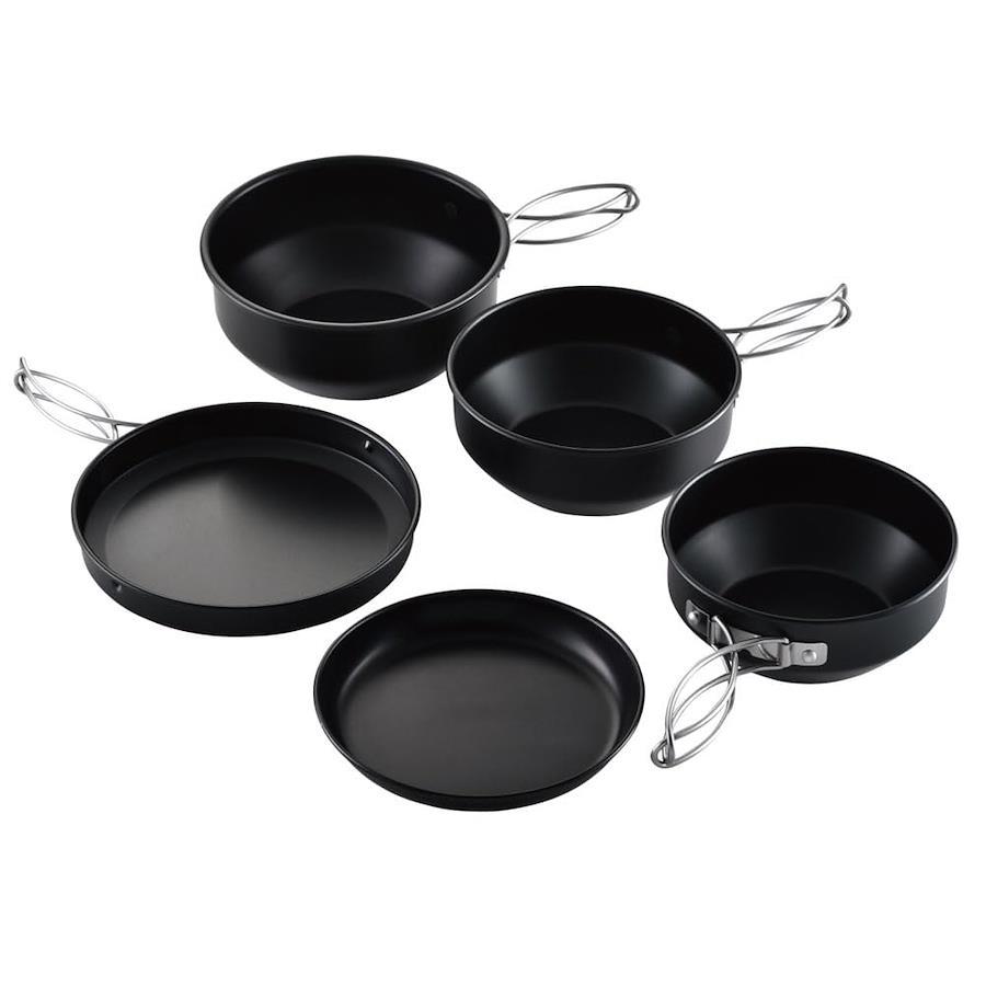 【カラー】ブラック【収納時サイズ】約Φ16.2×7.3(高さ)cm【サイズ】大鍋:約Φ14.2×6.5(深さ)cm/中鍋:約Φ13.3×5.5(深さ)cm/小鍋:約Φ12.4×5.2(深さ)cm/フライパン:約Φ15.2×2.3(深さ)cm/皿:約Φ13.8×1.9(深さ)cm 【総重量】約340g【満水容量】大鍋:0.9リットル/中鍋:0.7リットル/小鍋:0.55リットル【材質】本体:アルミニウム・アルマイト加工/ハンドル:ステンレス鋼