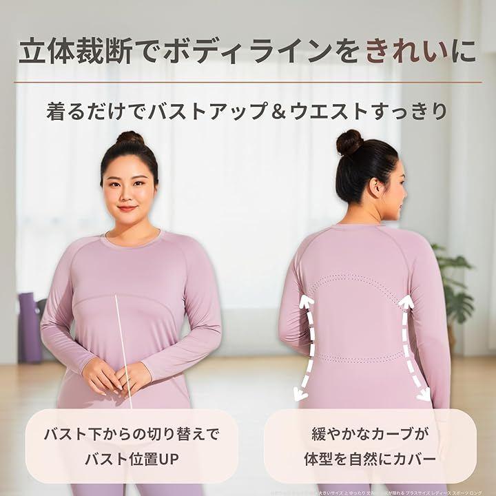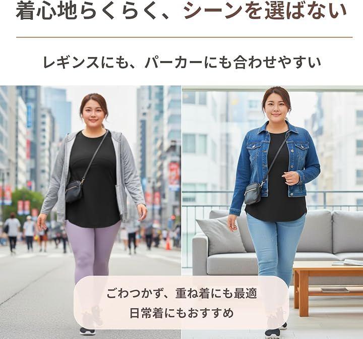 「着痩せを叶える美ライン立体裁断」 このロング丈トップスは、大きいサイズの体型カバーを意識した設計です。