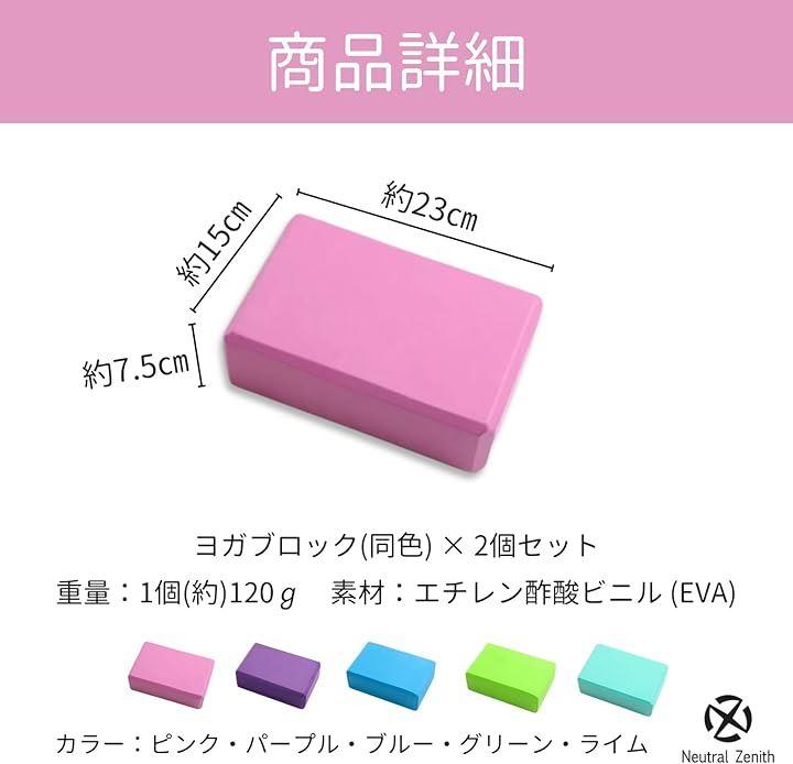 「商品詳細」ヨガブロック(同色) x 2個セット サイズ(約):23x15x7.5cm 重量:1個(約)120g 素材:エチレン酢酸ビニル (EVA) カラー:ピンク・パープル・ブルー・グリーン・ライム