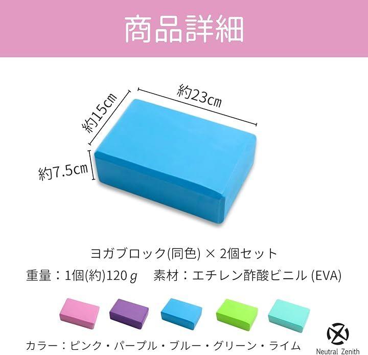 「商品詳細」ヨガブロック(同色) x 2個セット サイズ(約):23x15x7.5cm 重量:1個(約)120g 素材:エチレン酢酸ビニル (EVA) カラー:ピンク・パープル・ブルー・グリーン・ライム