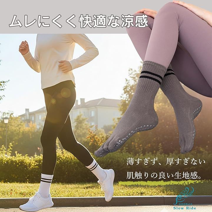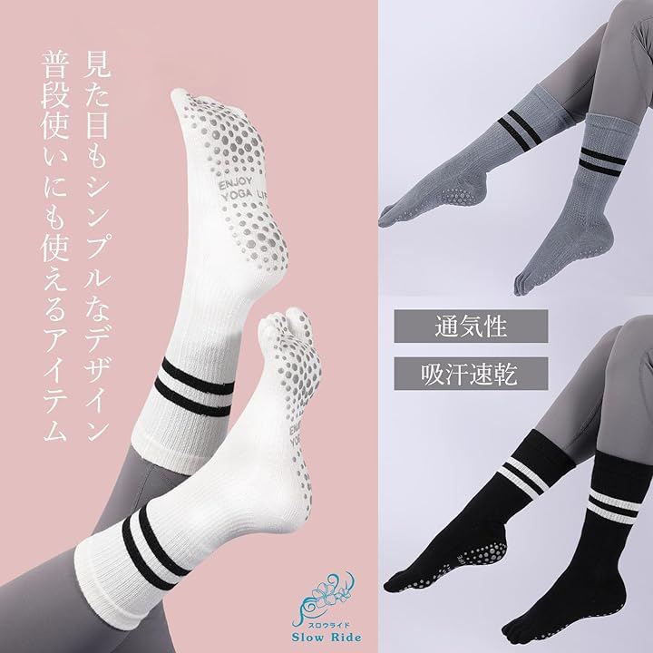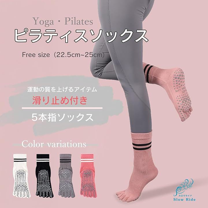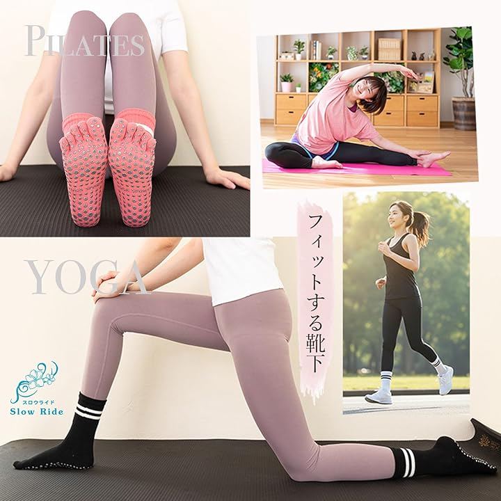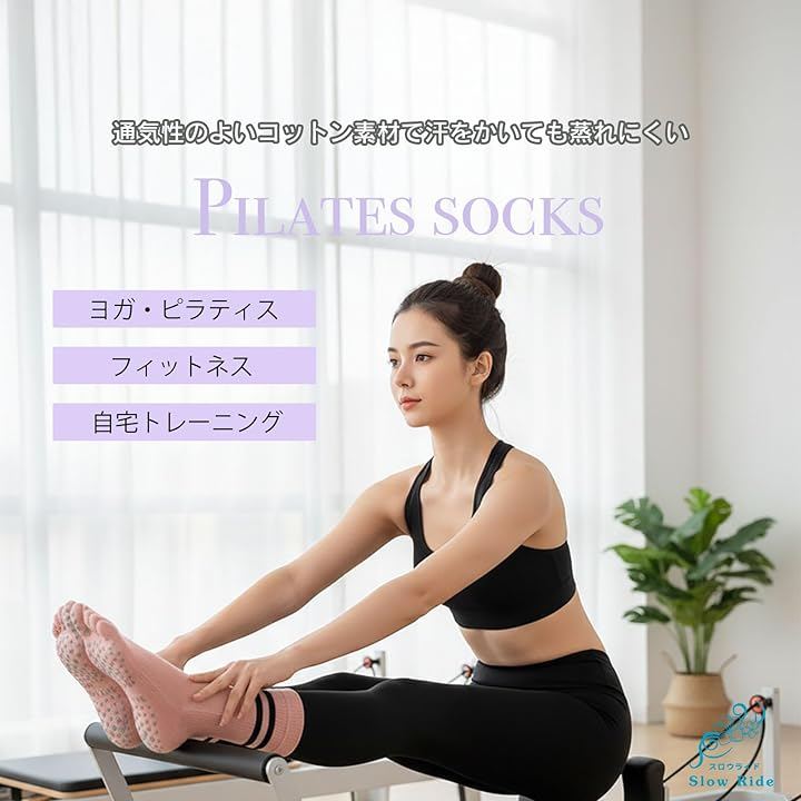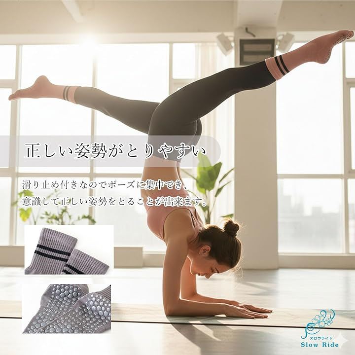 グリップ付き設計で滑りにくく、ヨガやピラティスの動作も安定感のある履き心地。