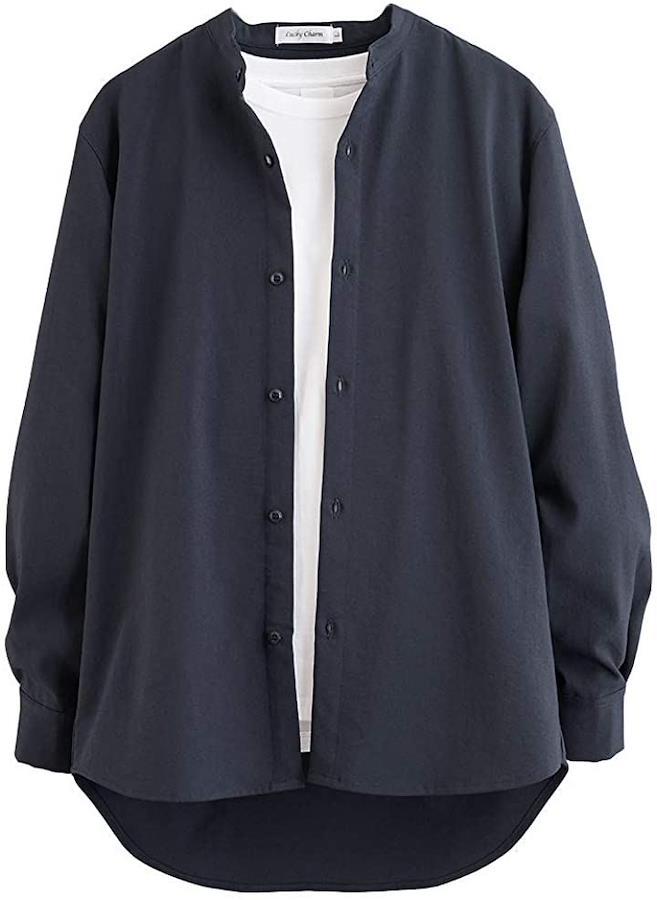 簡単にお洒落に見せるには、バンドカラーシャツが最適です。
