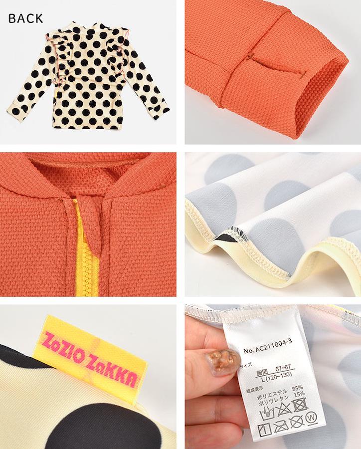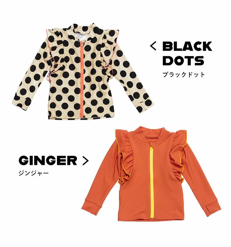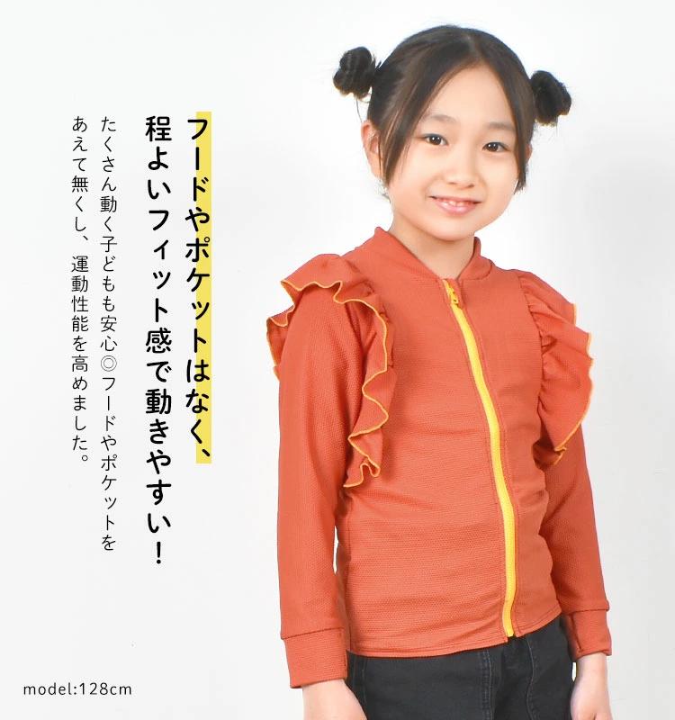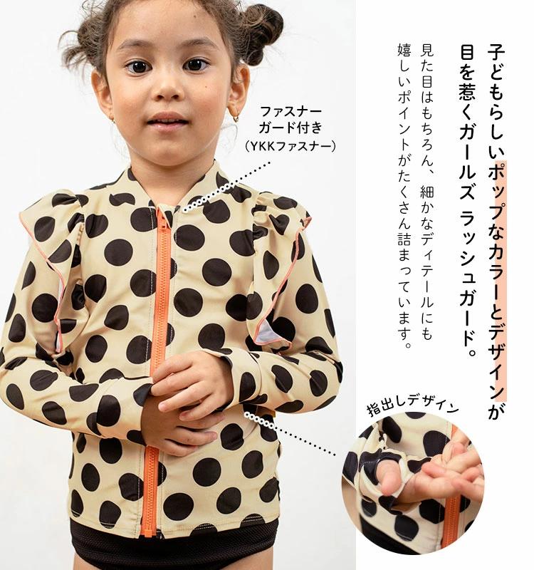 【ガールズラッシュガード】子どもらしいポップなカラーとデザインが目を惹くガールズ ラッシュガード。ファスナーは信頼のYKK製で首元に当たらないようガードがついています。たくさん動き回る子どもも安心!フードやポケットはあえて無くし、程よいフィット感もあるので運動性能を高めました。