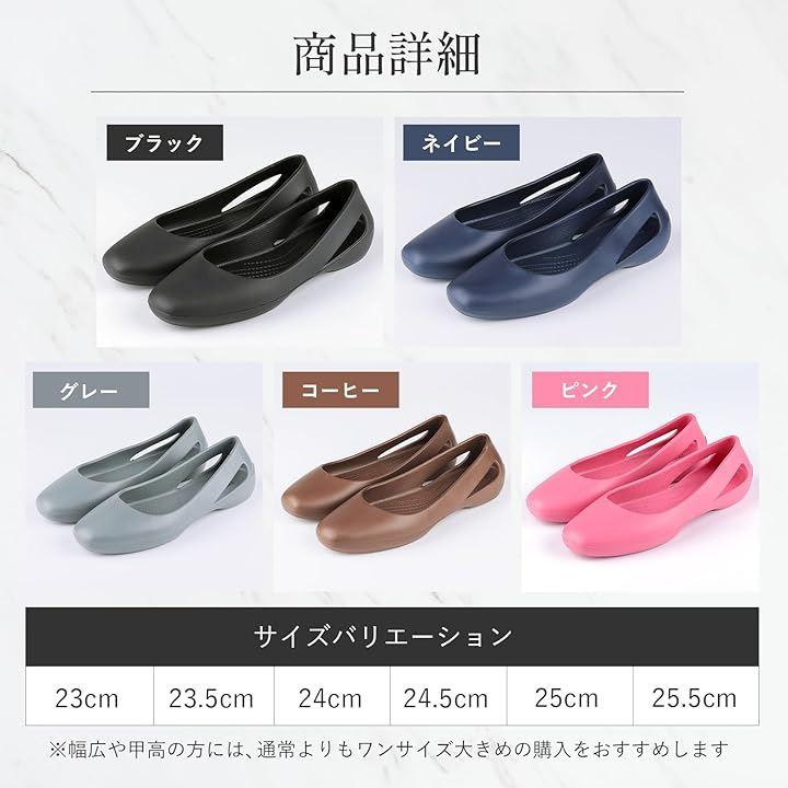 「豊富なカラーとサイズ展開」カラーはブラック、グレー、ブラウン、ピンク、ブルーの5色、サイズは23.0cmから25.5cmまで幅広いサイズ展開を揃えており、さまざまな足のサイズに対応します。