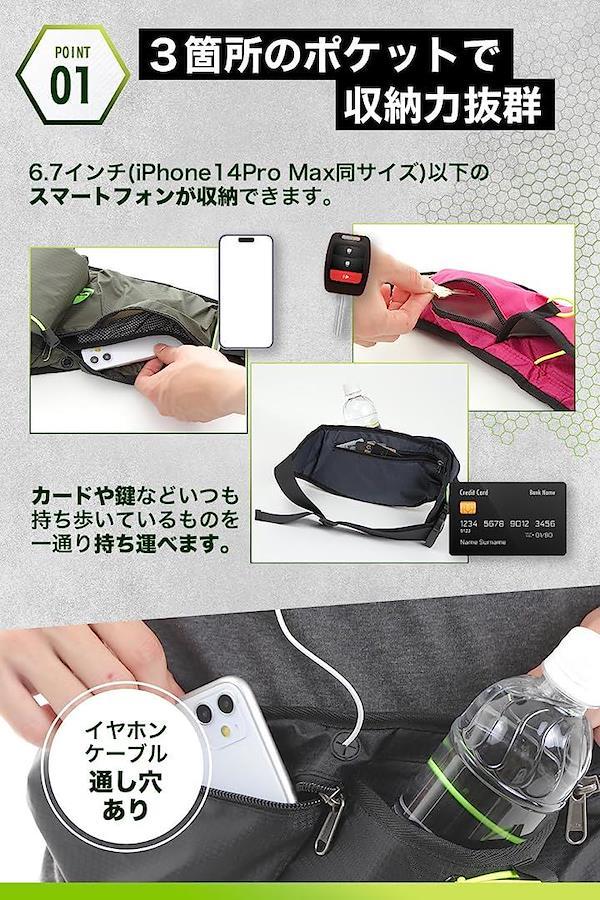 クレジットカードなどのカード類、iPhoneなどのスマートフォン、ペットボトル、鍵や小銭など小物をまとめて携帯することができるランニングポーチです。