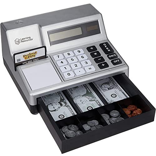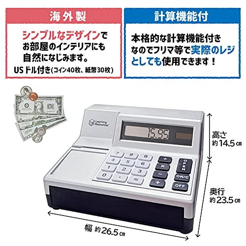 ホンモノそっくり!お店屋さんごっこ遊びで楽しく算数計算とお金の使い方を学ぼう!ごっこ遊びをする中で、お金の種類や数の大小など、「お金」の知識を身に付けながら楽しく金銭感覚が学べるおもちゃのレジスター。お金を収納するキャッシュドロアを開けると”チーン♪”と本物みたいなリアルな音がなるので、気分もアップ!内蔵電池は音用で、計算機は太陽電池で動きます。液晶部分も数字が大きくはっきりと映るので見やすく、ボタンも大きめなので打ちやすいです。ボタンには ON と OFF があるので、使わない時は OFF ボタンを押せば液晶部分が消えます。お子さまの知育にも役立つ存在感のあるラーニングリソーシズのレジスター!デザインも機能も満足のいくおもちゃのレジで、お友達やご家族と一緒にごっこ遊びを楽しもう!※音用電池 : 1.5Vボタン電池 LR44 x 1個 (商品に内蔵されております)【セット内容】レジスター 1個おもちゃのコイン (USドル) 40枚おもちゃの紙幣 (USドル) 30枚おもちゃのクレジットカード 1枚メモ帳 1冊日本語取扱説明書 世界80カ国以上で愛されるラーニングリソーシズ(Learning Resources)のおもちゃのレジスター。リアルな道具で職業体験。本物みたいなレジスターでお店屋さんごっこをしよう。 アナログレジが選ばれる理由!バーコードレジでは計算は学べません。数字を押して計算するアナログレジだからこそ考える力が育ち、楽しく遊びながら「算数」が学べます。 本格的な計算機能付きで、リアルなお買い物ごっこが楽しめる工夫がいっぱい。ごっこ遊びを通してお金の種類や数の大小など、「お金」の知識を身に付けながら楽しく金銭感覚も学べます。 太陽電池で動く計算機。引き出しを開けると”チーン♪”と音がなるので、気分もアップ! / 音用電池付属 : 1.5Vボタン電池 LR44 x 1個 / 日本語パッケージ・日本語取扱説明書付き パッケージサイズ : 約 幅 28.2cm x 高さ 15.8cm x 奥行 25cm / 本体サイズ : 約 幅 27cm x 高さ 15cm x 奥行 24cm / おもちゃのクレジットカードとUSマネー (紙幣 30枚、コイン40枚) 付き / 対象年齢3歳以上