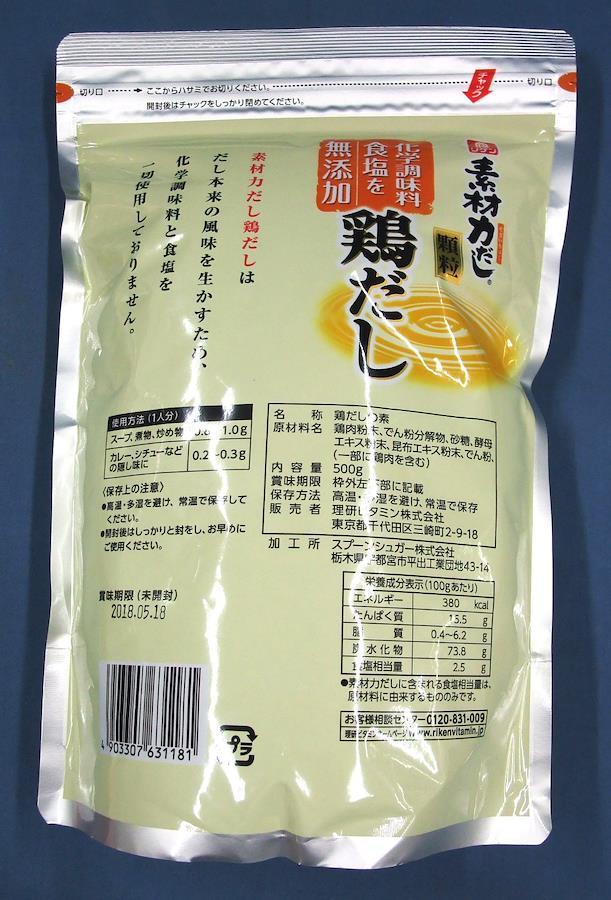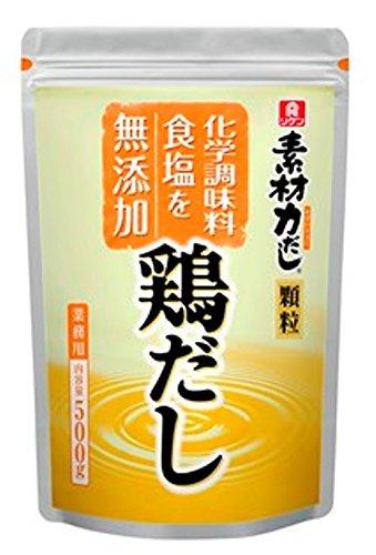 素材本来の風味にこだわり、化学調味料(アミノ酸等)、食塩を使用しない風味豊かな顆粒状だしです。鶏肉粉末を増量し、鶏本来のやさしい香りと旨みが増しました。煮物、スープの場合に一人前約0.8~1.0g、カレー、シチュー等の隠し味の場合に1人前約0.2g~0.3g。