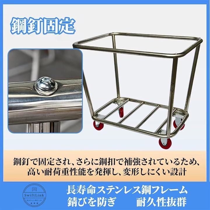 長寿命ステンレス鋼フレーム:高品質ステンレス鋼フレームが錆びを防ぎ、清掃簡単で衛生的、重い荷物にも耐える強度を持ち、長く使える。