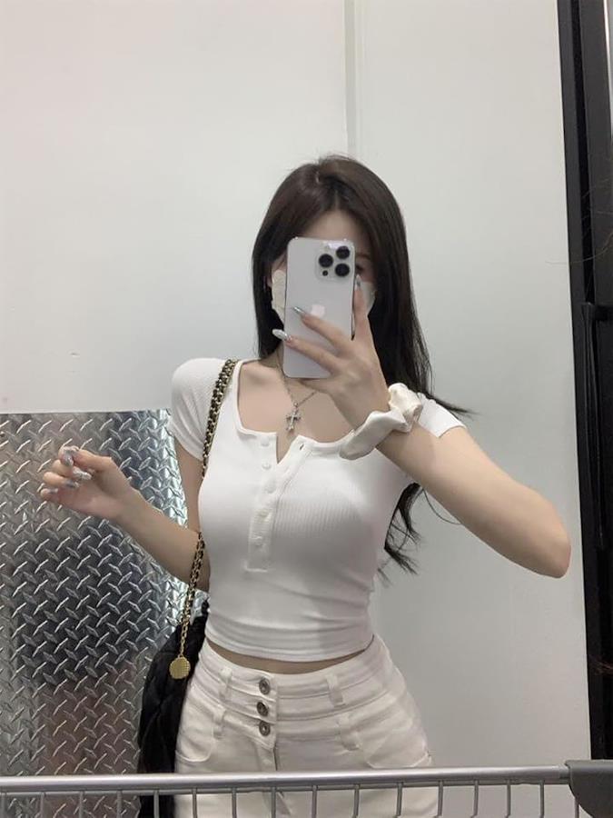 「今っぽかわいい。最旬クロップドTシャツ」シンプルなのにトレンド感たっぷり。リブ素材xフロントボタンで仕上げたこの半袖Tシャツは、1枚で“こなれ感”が叶うアイテム。