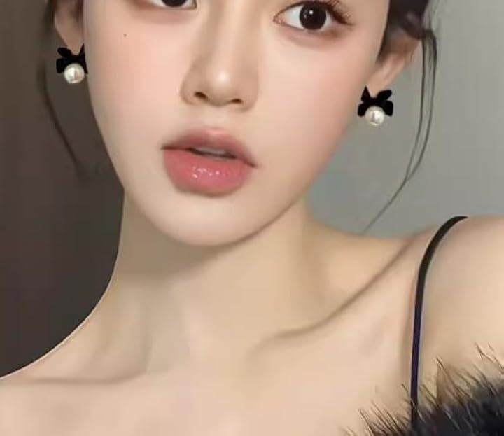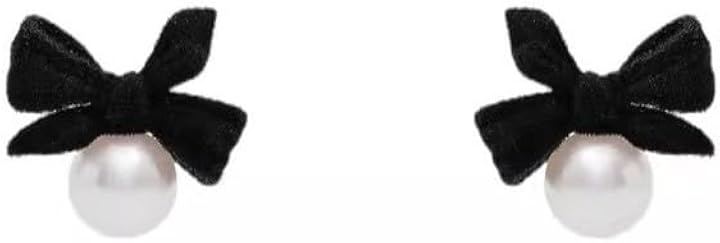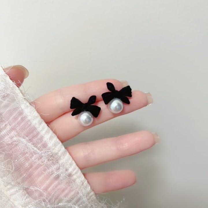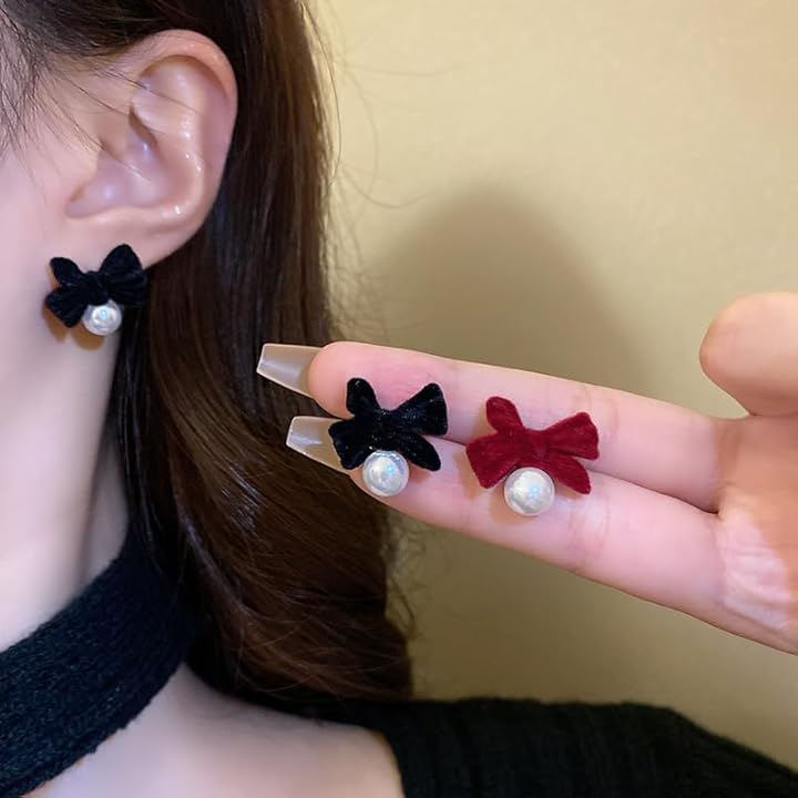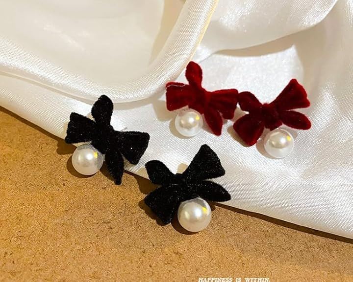 可愛いパール付きリボン 両耳用ピアス ブラック/レッド