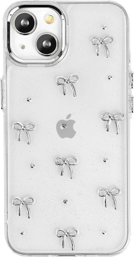 「可愛さと高級感を両立したリボン スマホケース」 シルバーの小さなリボンとパール、そしてキラキラと輝く控えめなラメが散りばめられた、上品で可愛らしいiPhoneケースが登場しました。