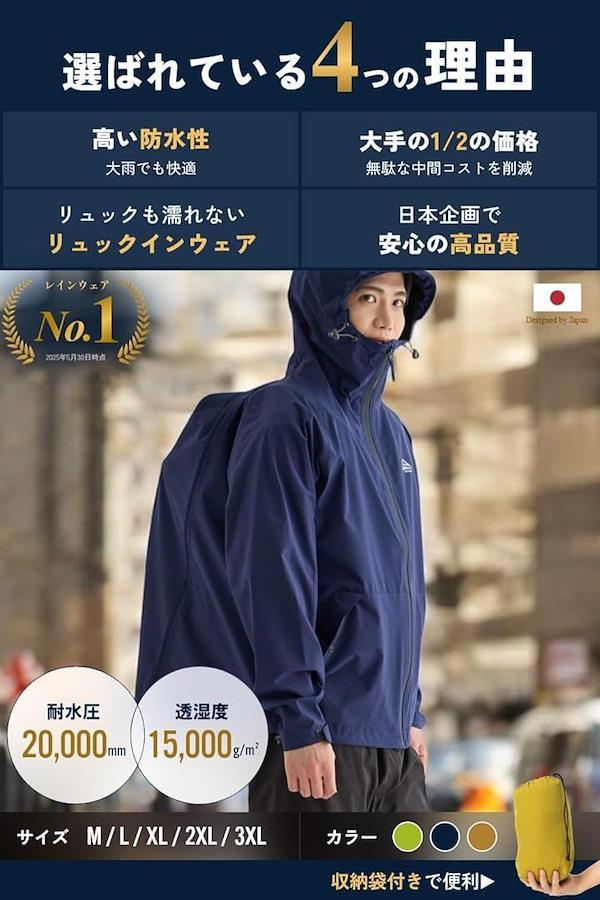 「大雨でも快適な耐水圧15,000mm・透湿5,000g/m2の高性能」 自転車やバイクでの運転を想定し、高い防水性とムレにくい透湿性を両立。
