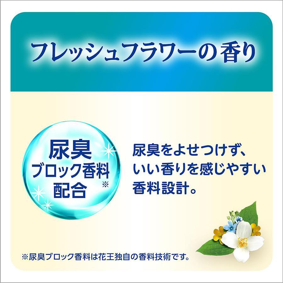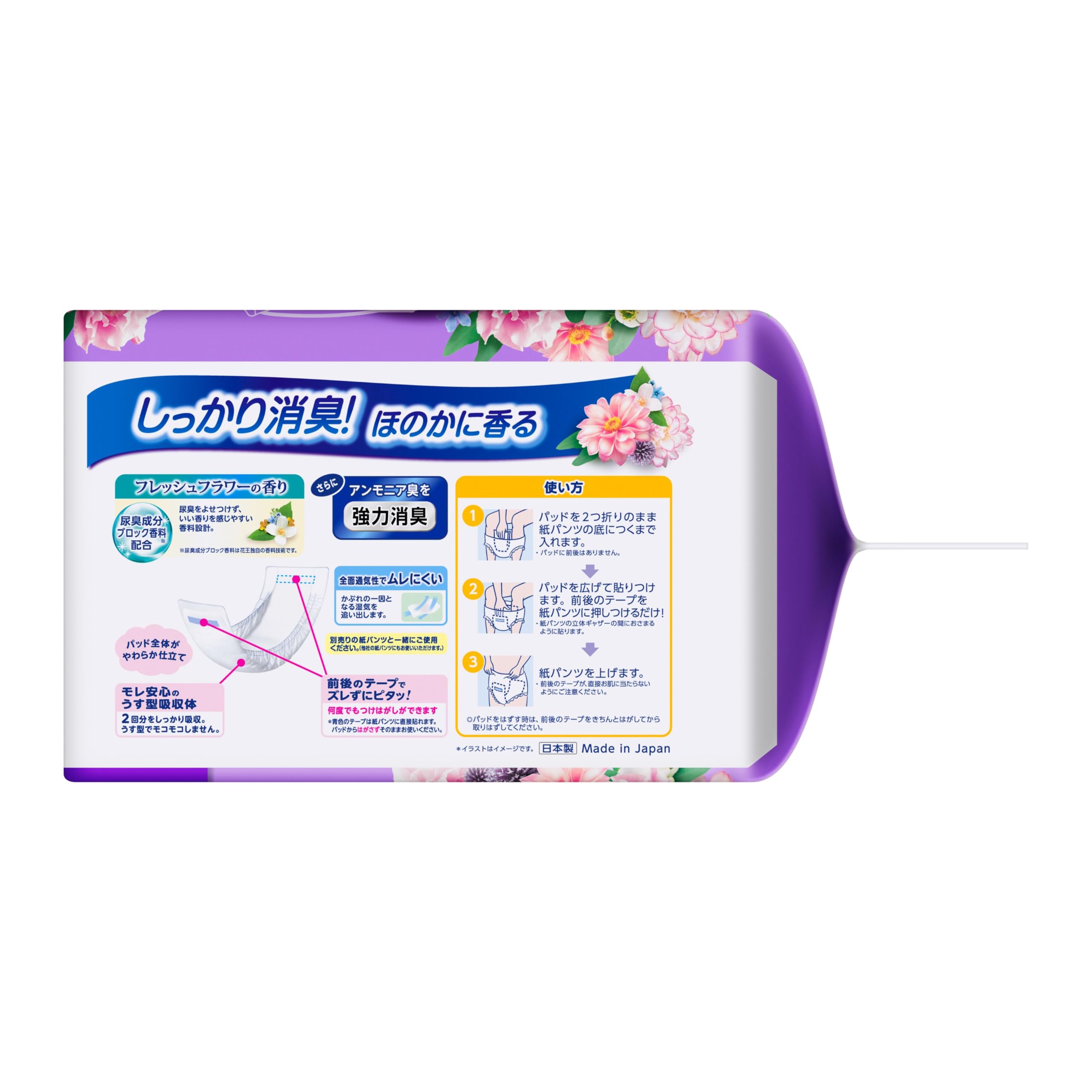 ●しっかり消臭!ほのかに香る(フレッシュフラワーの香り)尿臭成分ブロック香料※配合で尿臭をよせつけず、いい香りを感じやすい。さらにアンモニア臭を強力消臭。※花王独自の香料技術・立体ギャザーで横モレをブロック。●前後のテープが紙パンツにピタッとついてズレにくい。●目印線で紙パンツにつけやすい。●全面通気性。●うす型吸収体でモコモコしない。●しっかり2回分吸収。(医療費控除対象品) しっかり消臭!ほのかに香る(フレッシュフラワーの香り) 目印線で紙パンツにつけやすい しっかり2回分吸収(医療費控除対象品)