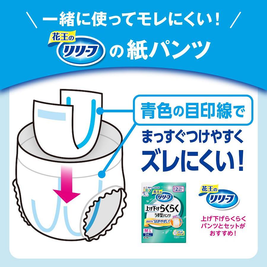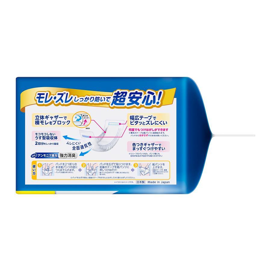 モレ・ズレしっかり防いで超安心!・立体ギャザーで横モレをブロック。・幅広テープが紙パンツにピタッとついてズレにくい。テープは何度でもつけはがし可能。●ギャザーの青色の目印線で紙パンツにつけやすく、自分でも取りかえやすい。●アンモニア臭を強力消臭。●全面通気性で、かぶれの一因となる湿気を追い出しムレにくい。●うす型吸収体だからモコモコしない。●しっかり2回分吸収。(医療費控除対象品) モレ・ズレしっかり防いで超安心!立体ギャザーで横モレをブロック ギャザーの青色の目印線で紙パンツにつけやすく、自分でも取りかえやすい しっかり2回分吸収(医療費控除対象品)