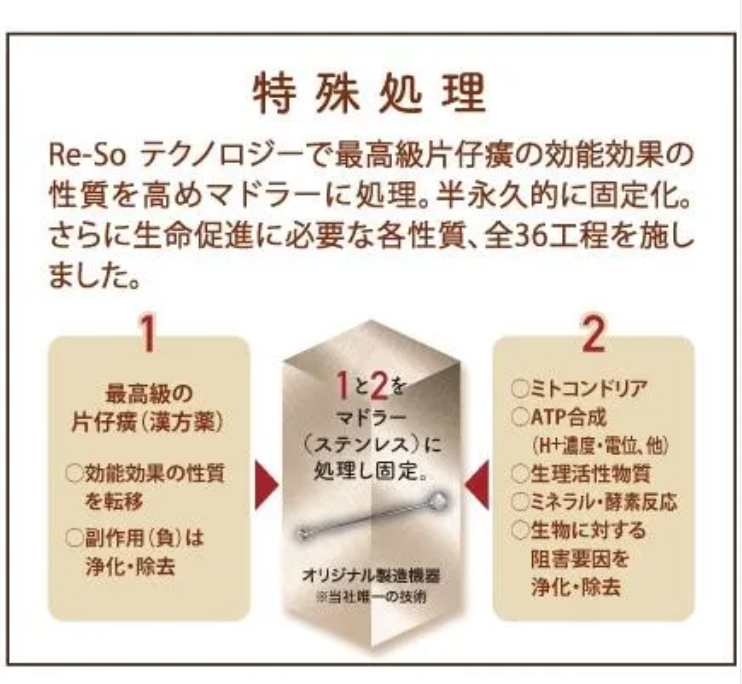オリジナル製造機械を用いて 《リ・ソ性質:物質や生物システムが持つ普遍的な性質》 プラス 《片仔廣》 という漢方の性質を、マドラーに固定処理。