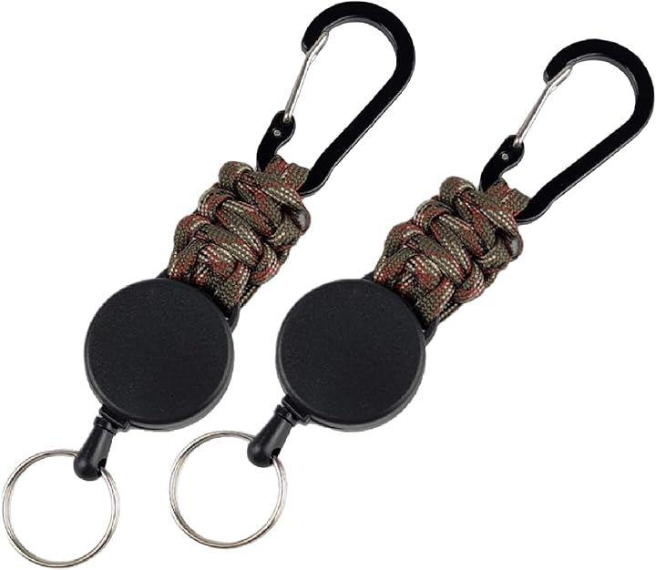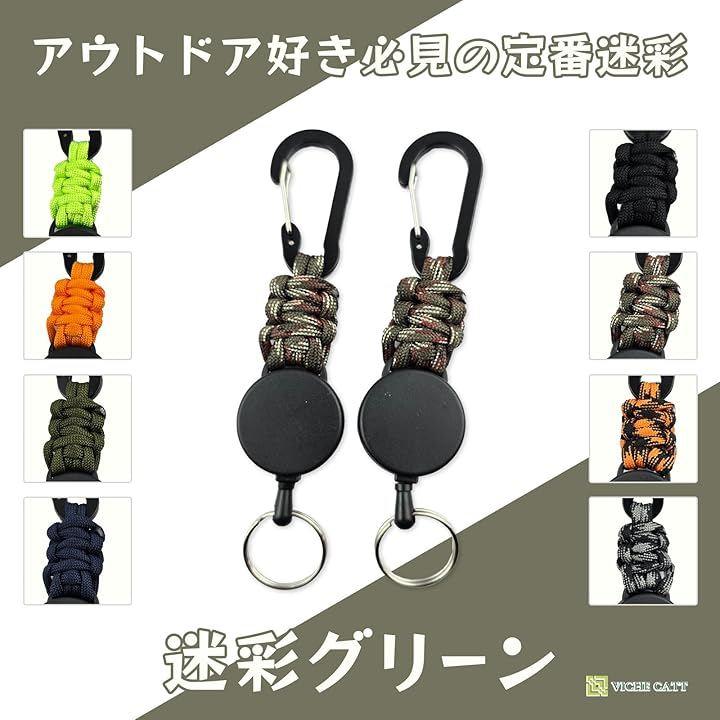 このリールキーホルダーは、伸縮性のあるワイヤーとパラコード製ストラップを組み合わせた便利アイテムです。