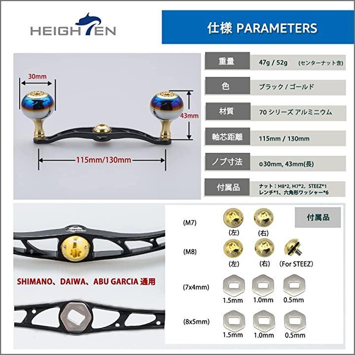 ・「サイズ」ハンドル軸心距離115mm/130mm、ノブ直径30mm 「総重」47g/52g(センターナット含)「素材」70シリーズ航空アルミ。