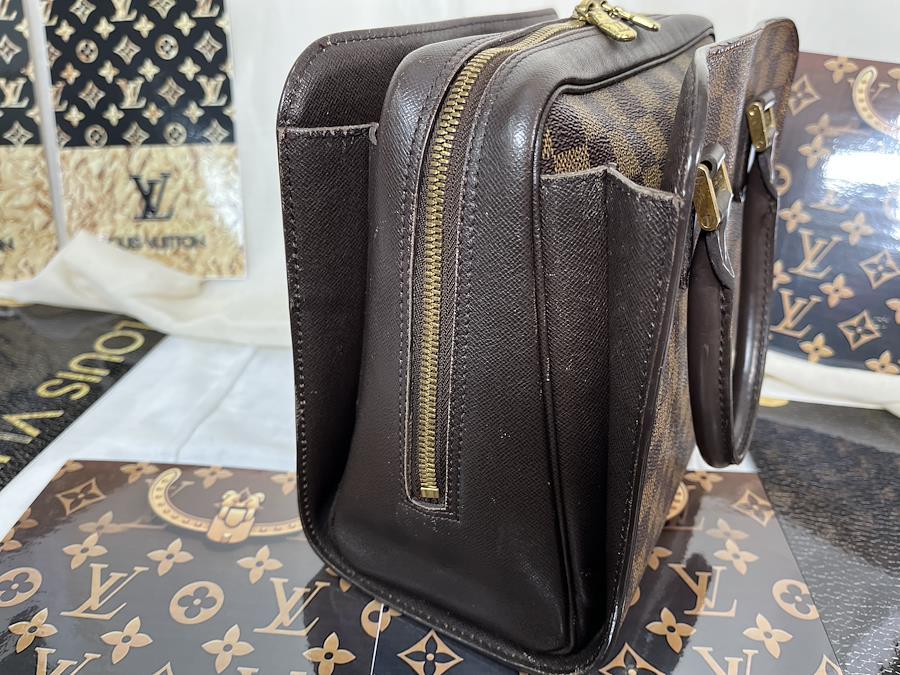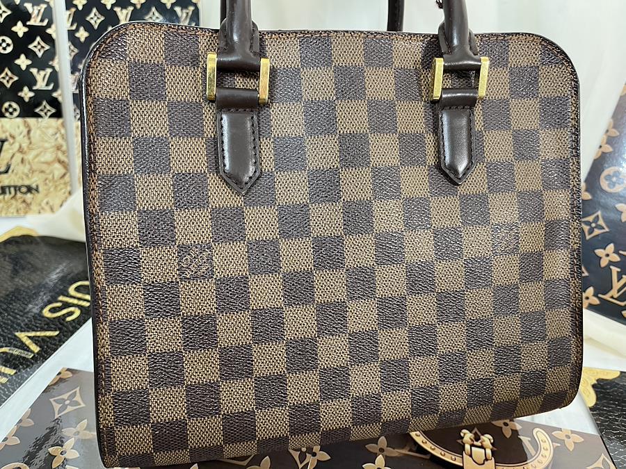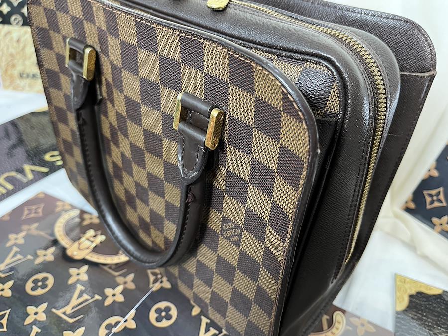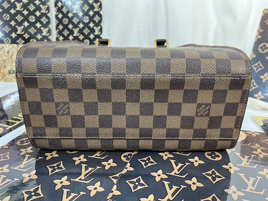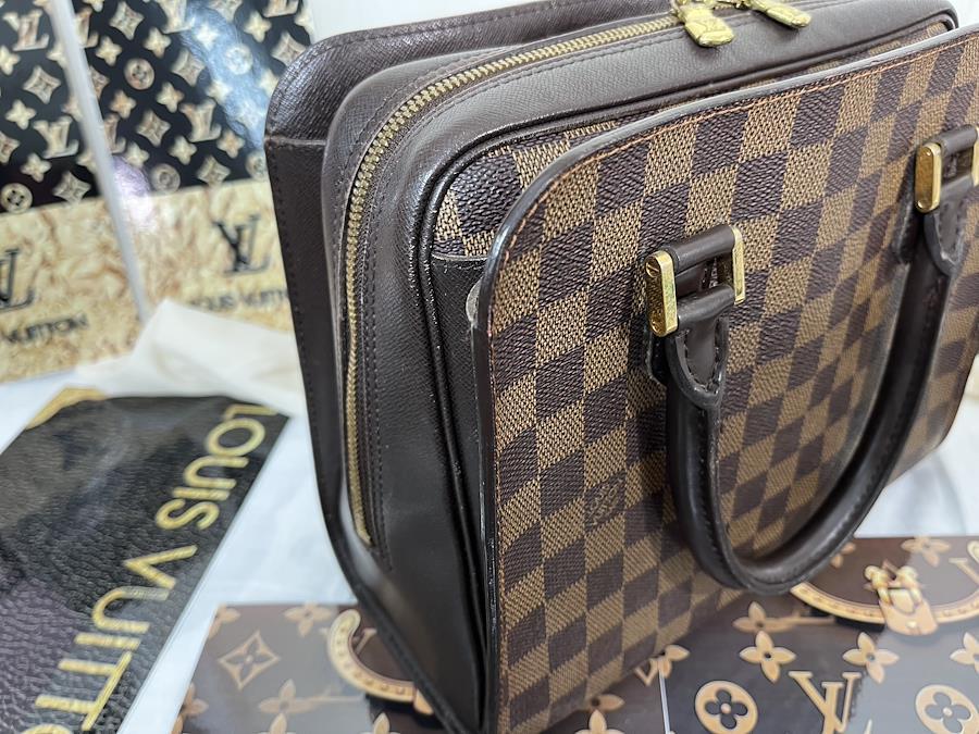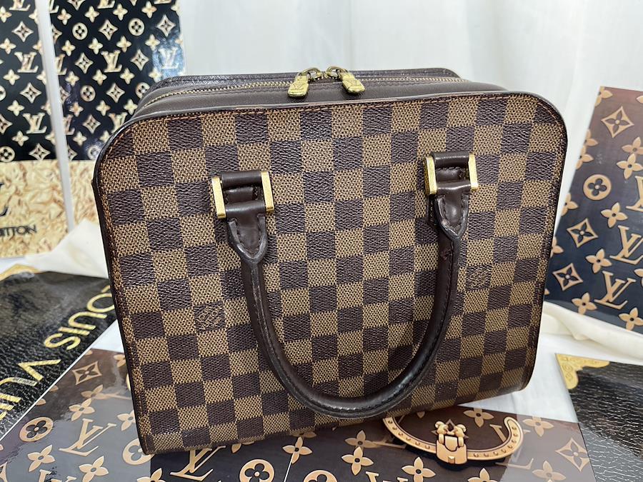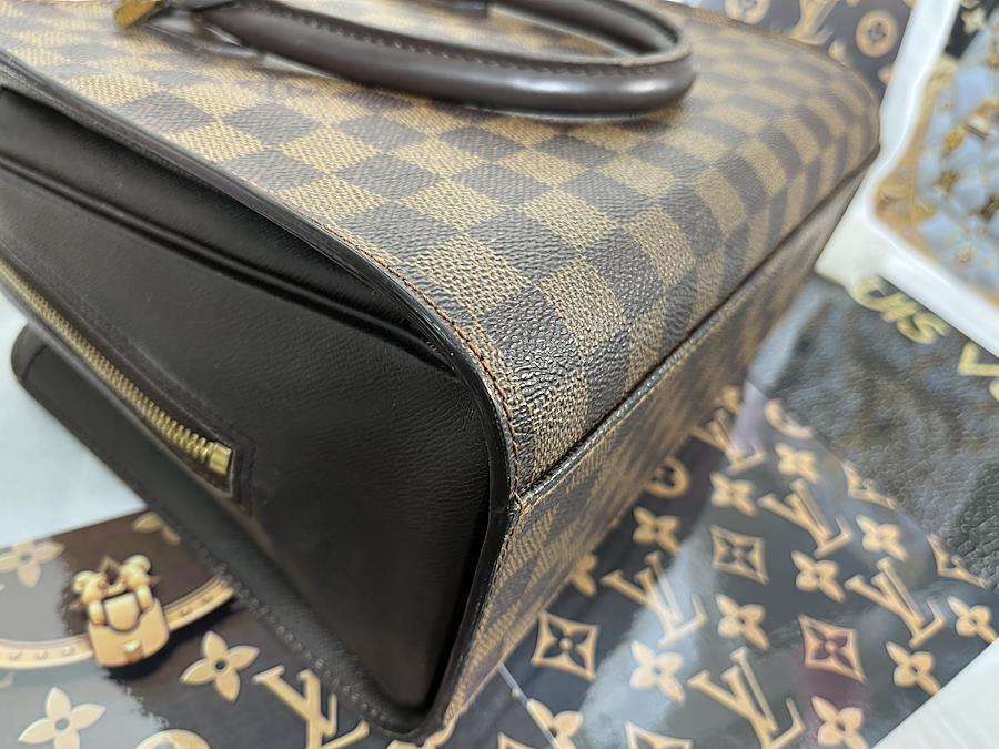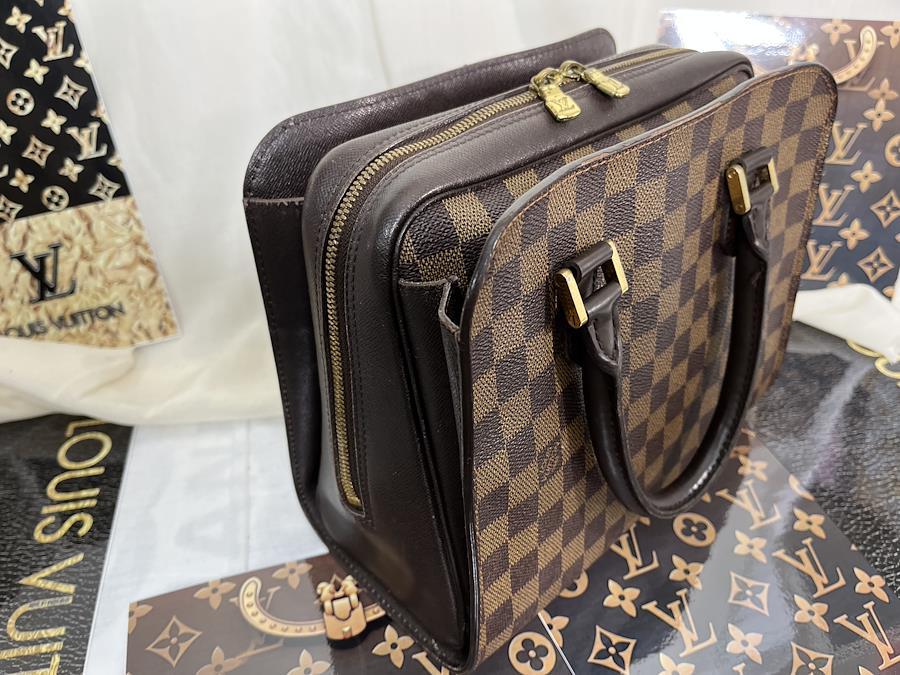 ご覧いただきありがとうございます。こちらは LOUIS VUITTON(ルイヴィトン) の定番ライン、ダミエ エベヌ「トリアナ」です。上品なブラウンの格子柄は落ち着きがあり、カジュアルからきれいめまで幅広い装いに自然に馴染みます。スクエア型の端正なフォルムは持つだけで品格が増し、ヴィトンらしい存在感を楽しめる一品。マチがしっかりあり、必要な荷物をきちんと整理しやすいのも魅力です。デイリーはもちろん、通勤やお出かけ、きちんとした場面にもおすすめです。