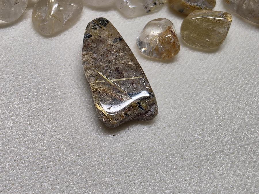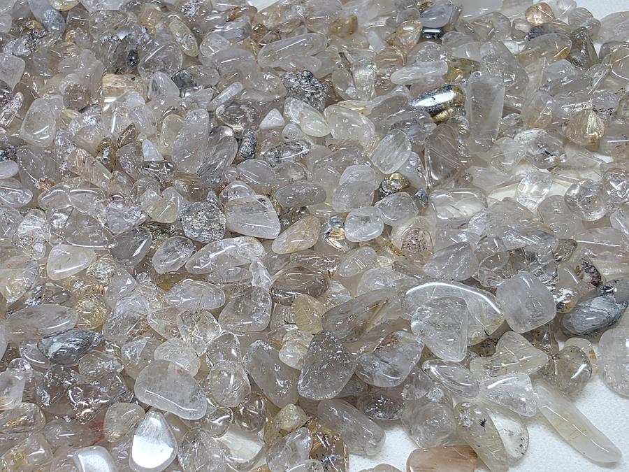 ルチルクォーツのさざれ石です。大きさはランダムで、ヘマタイト入りのものも入っています