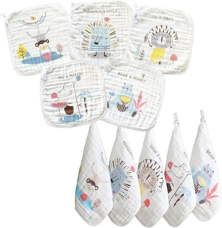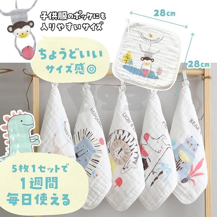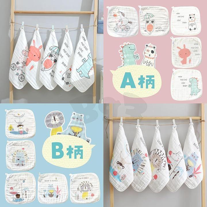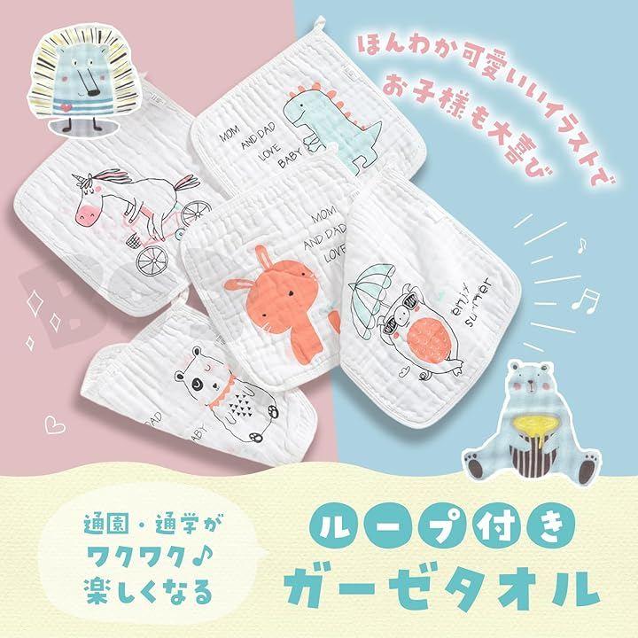 ループ付きタオル5枚セット Aセット・Bセットの2種類をご用意 サイズ:28cmx28cm 素材:綿(ガーゼ) 重量:約30g(一枚)