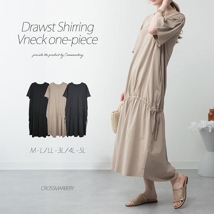 女性らしい抜け感を生み出すドロストシャーリング Vネックワンピース Vネックのデザインがデコルテラインを美しく見せ、程良い抜け感と女性らしさを引き立てます。