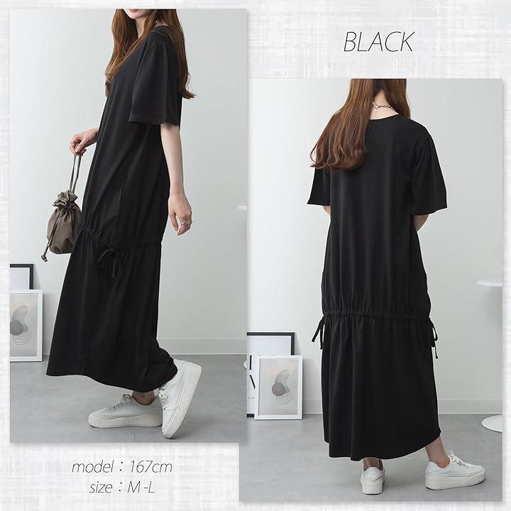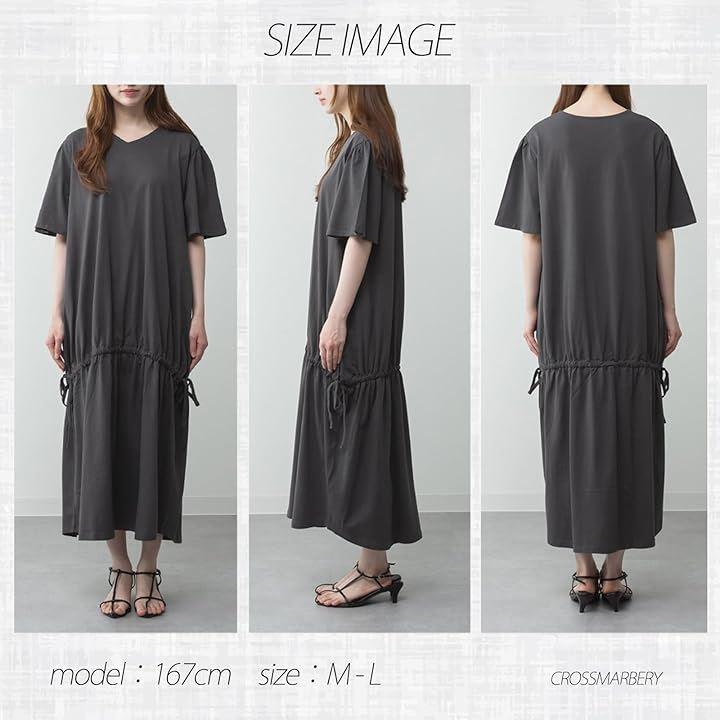 女性らしい抜け感を生み出すドロストシャーリング Vネックワンピース Vネックのデザインがデコルテラインを美しく見せ、程良い抜け感と女性らしさを引き立てます。