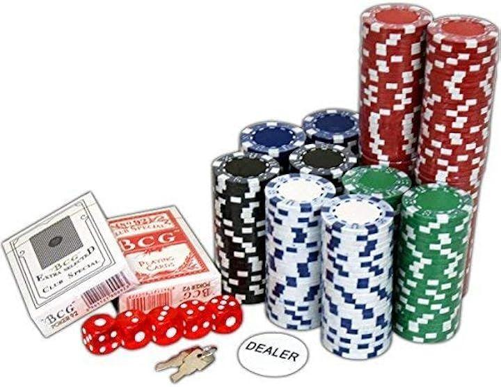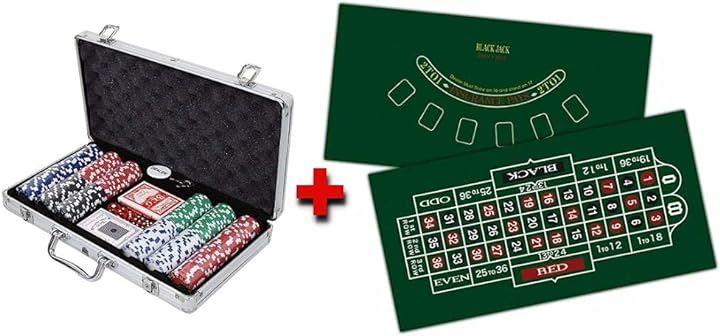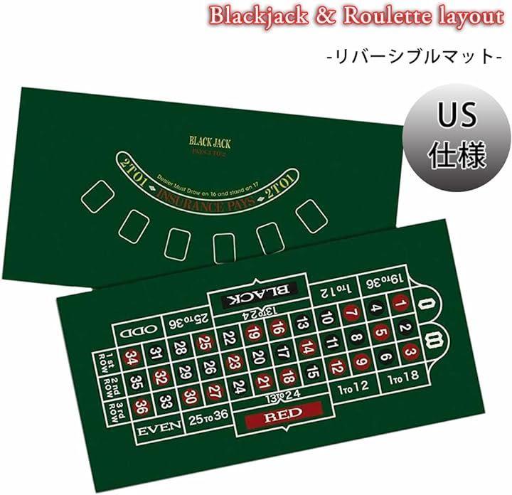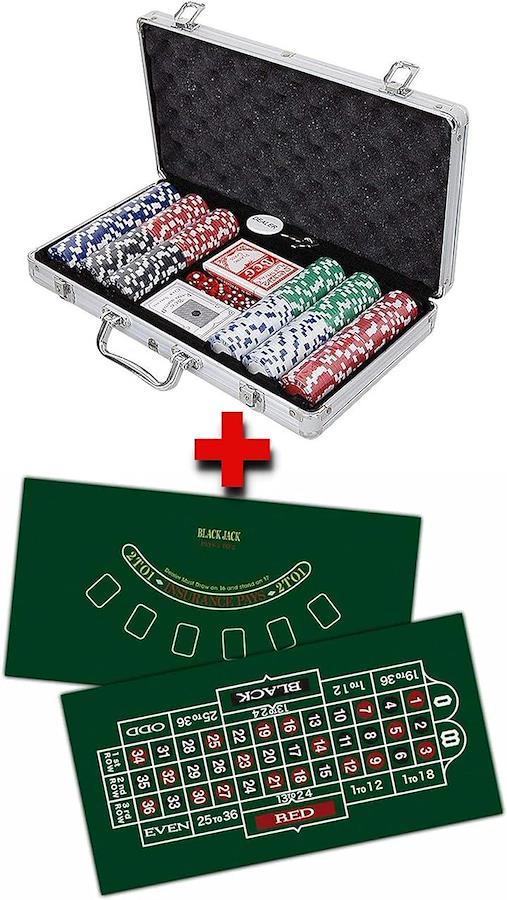 本格仕様のカジノチップ300枚、ダイス、カード、ディーラーボタンとルーレットとブラックジャックのリバーシブル・プレイマットのセットです。