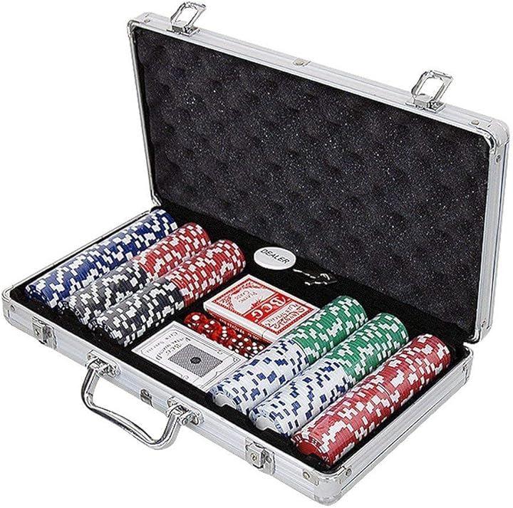 重厚なアルミ製アタッシュケースにカジノチップ300枚、ダイス5点、トランプカード2組、ディーラーボタンが同梱されております。