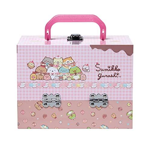 大人気アイテム、「すみっコぐらしバニティメイクボックス」の新デザインが登場です。 今回は美味しそうなスイーツに囲まれたすみっコたちがとてもキュートな仕上がりになっています。 ハート型の3色のアイシャドウパレットと、ネイルカラー、リップグロス、リップスティック、ヘアゴムが揃った大人も顔負けの本格コスメセット。 そして、今回はハートのスパンコールがキラキラ可愛いパッチンどめやコームが新たに入ります。 ネイルは水溶性なので水で簡単に落とせます。