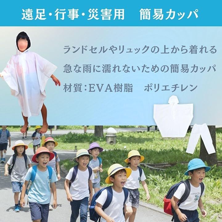 セット内容: レインポンチョとレインパンツ、専用ポーチがセットになっており遠足や行事用の雨具として便利です。