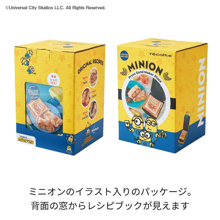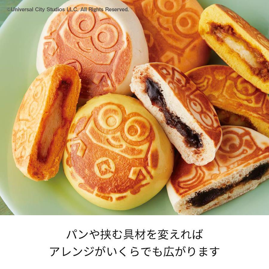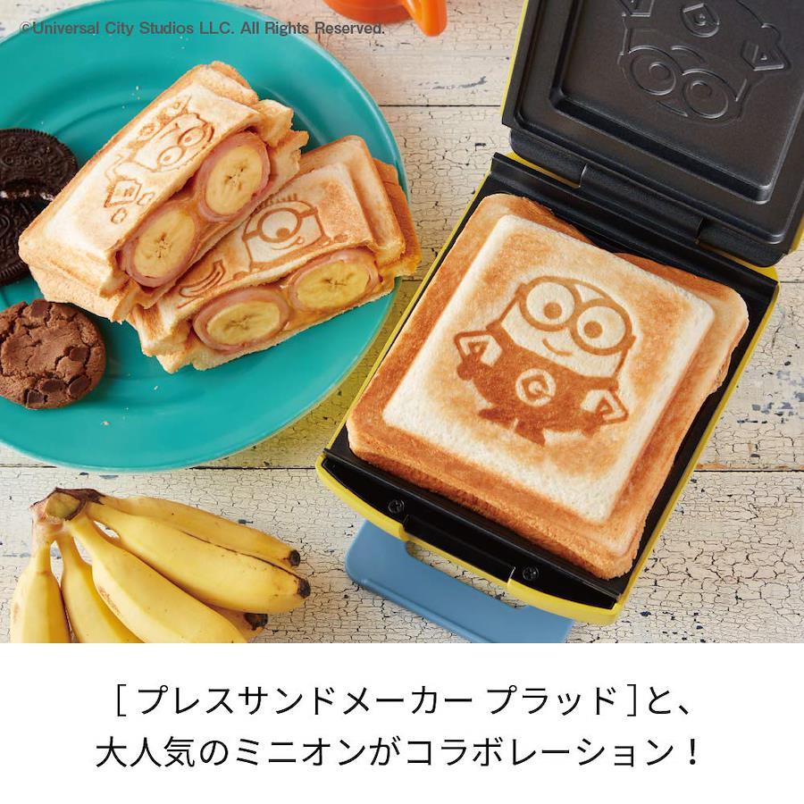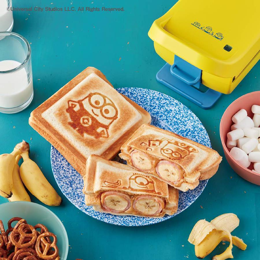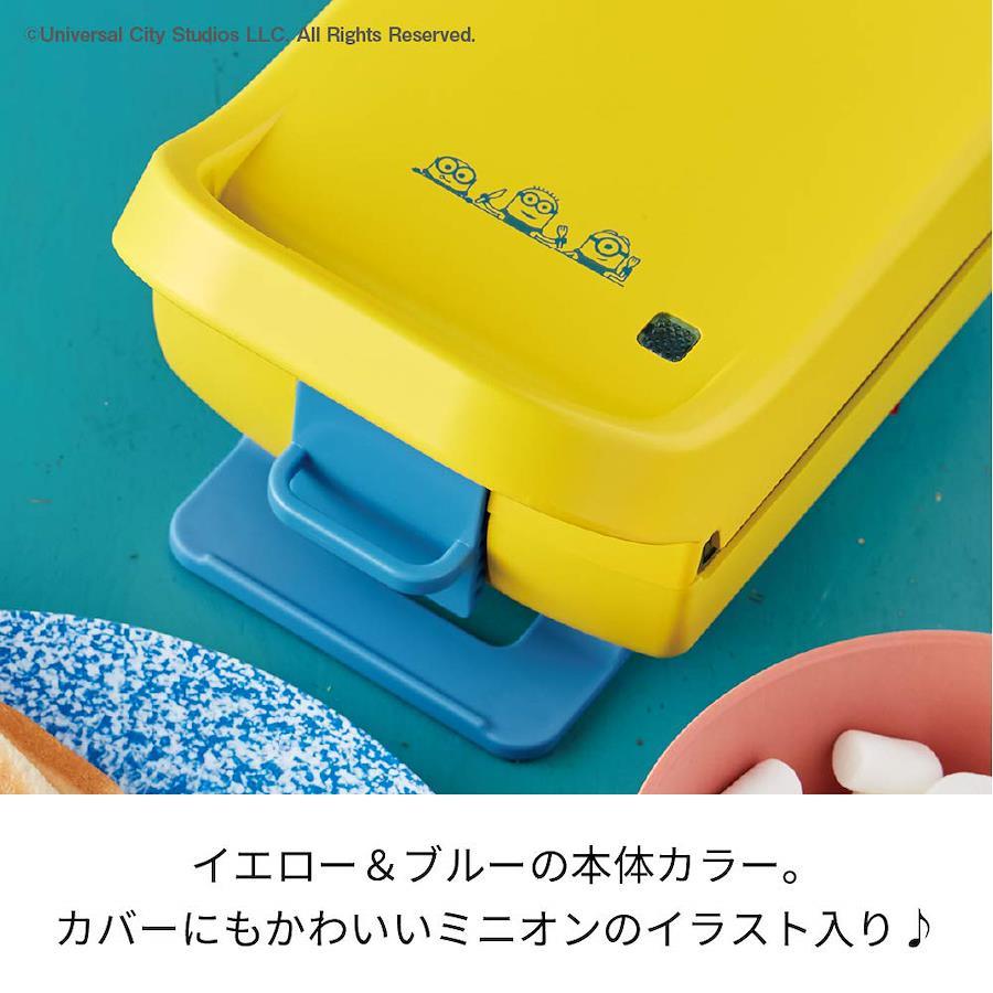 ?[ミニオンの焼き目がかわいい!限定プレート]表と裏で違うミニオンの焼き目がつく限定仕様です。本体カラーもミニオンにちなんだイエロー&ブルー。?[予熱後約2分半で食パンの耳までカリッしたホットサンドを焼き上げます]具材がたっぷり挟めるので、分厚いホットサンドが楽しめます。?[中身がこぼれにくい]耳までしっかりプレスするから、中身がたっぷり入っていてもこぼれにくく、ワンハンドでも食べやすい!?[ミニオン・コラボのためのオリジナルレシピ付き]ミニオンの大好物のバナナを使ったレシピも♪?[挟む具材次第でアレンジも無限大!]食パンだけでなく、バゲットやイングリ