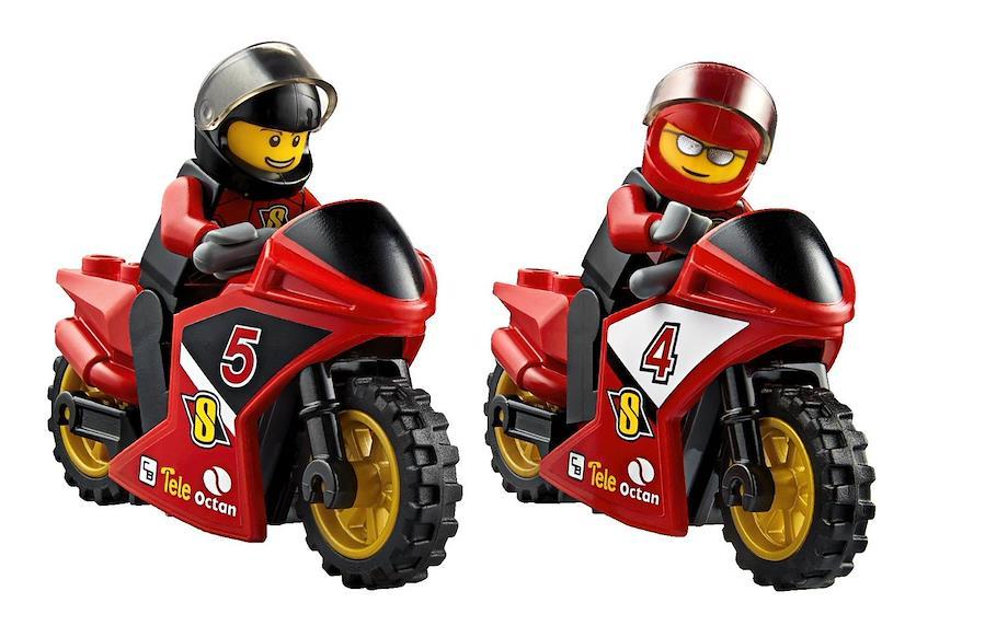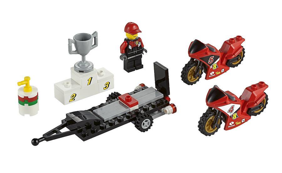 レゴシティでバイクレースがあるよ! いそいでレースチームをサーキットまで運ぼう! 2台のバイクを荷台につんで、ライダーをのせて出発! サーキットでは大ぜいのかんきゃくが待っているよ。ひょうしょう台の真ん中に立つのはだれだ?2体のレースライダーのミニフィギュアとアクセサリ付き。