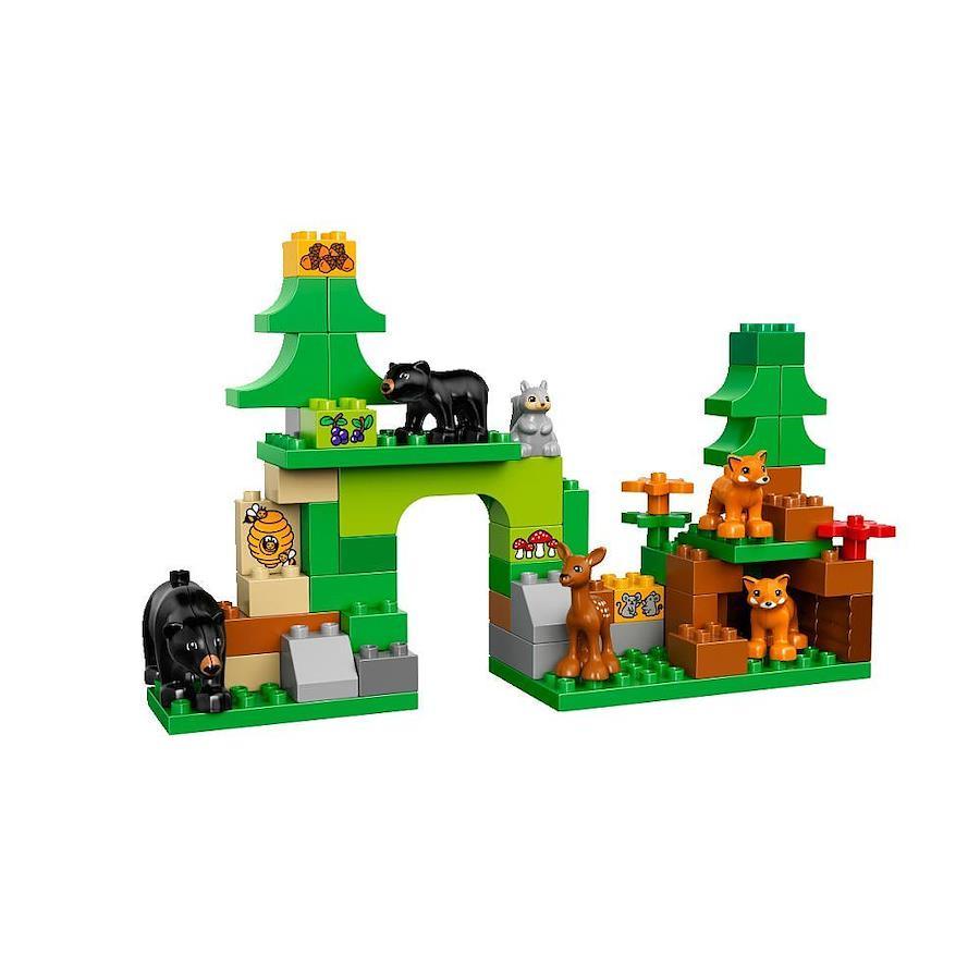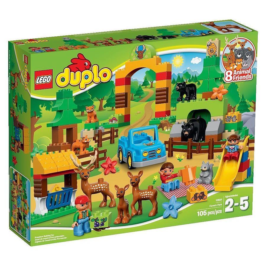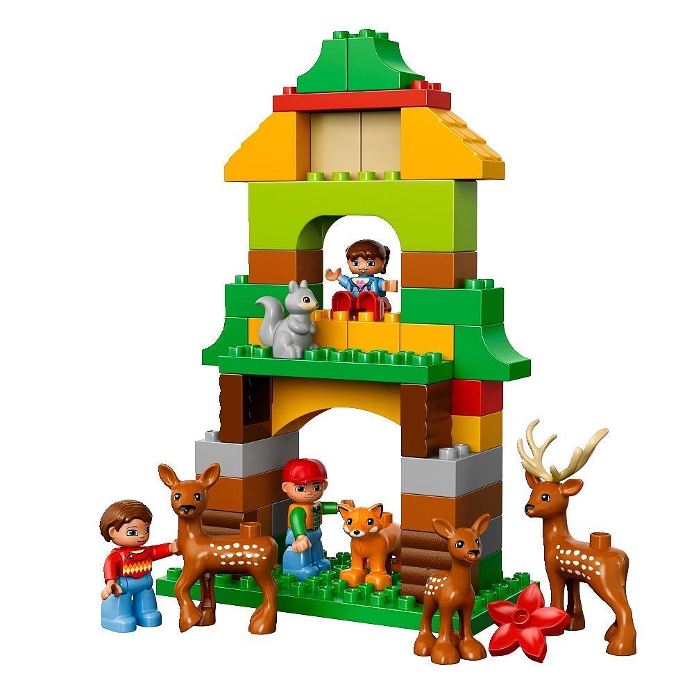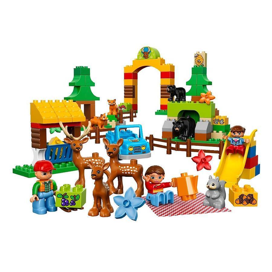 デュプロ?の森のこうえんで一日中遊ぼう! もりのこうえんではリスが走り回っているよ。シカの家族におうちを作ってあげよう。車でクマの住むほら穴を見に行ったり、キツネの住みかをのぞいてみよう。お腹がすいたらピクニック。動物たちは何を食べるのかな?食べおわったら、すべり台で遊ぼう。 動物やお人形をつかってごっこ遊びを楽しみましょう。動物の名前をおぼえたり、森や自然のこと、そこに住む動物のことなどお話しながら遊びましょう。 小さなお子さまにも扱いやすく安全設計のデュプロブロックで、クルマ、小屋、ゲート、森の洞くつ、木、すべり台の組み立ても楽しめます。 お母さん、お父さん、子どもの3体のお人形と、シカの家族、クマの親子、キツネ2体、リスが入っています。
