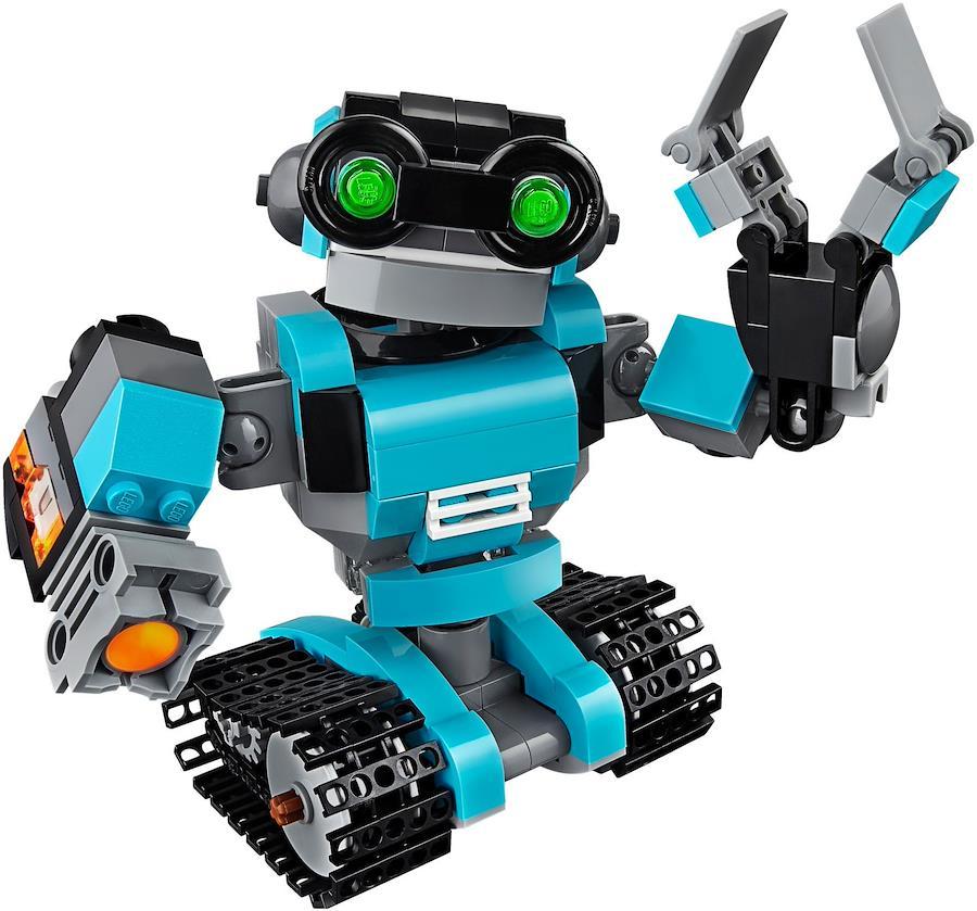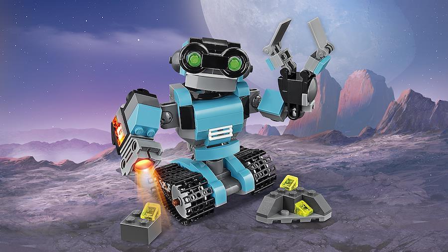 大きな頭と緑の目をした、水色、黒、灰色のフレンドリーな調査ロボットを紹介しよう。腕や頭、胴体を動かしたり、トラックベルトの脚で移動したりできるぞ。右手についているクールなサーチライト機能をオンにしたり、つかめる手でいろいろな物を運ぼう! 光るジェットパックを背負ったロボット犬や、目が光るロボット鳥に変身させることもできるよ!