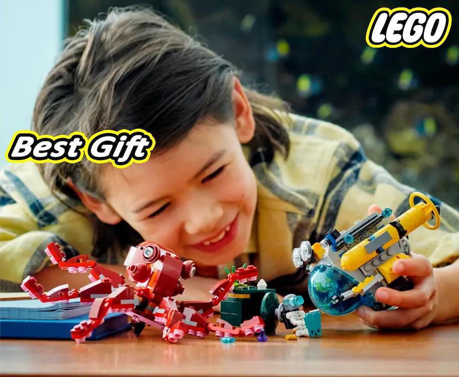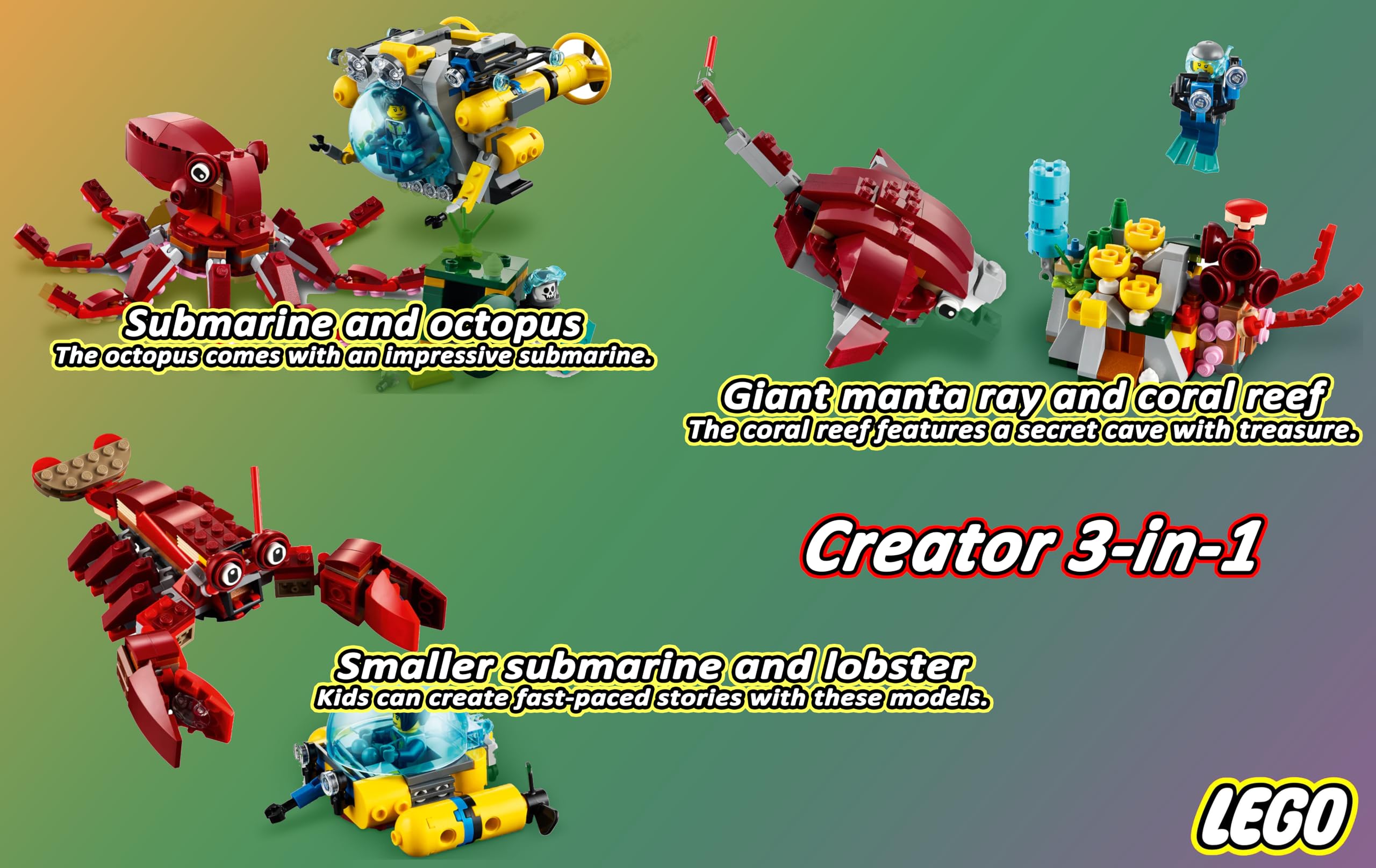 8歳以上のお子様は、素晴らしいレゴクリエイター3in1サンケントレジャーミッション(31130)でスリリングな水中アドベンチャーを楽しむことができます。 無限の遊びの可能性 - 子供たちはタコと潜水艦、巨大なロブスターと小さな潜水艦、または巨大なマンタ、ダイバー、サンゴ礁で物語をプレイすることができます。機能が満載。潜水艦にはコックピット、カメラ、プロペラ、カーゴハッチがあります。 小型の潜水艦にはコックピットとプロペラがあり、サンゴ礁には秘密の洞窟があります。外出先で遊べます。寸法は3インチ以上です。 高さ8cm、4.5インチ。 長さ12cm、4インチ。 幅10 cmの潜水艦のおもちゃは、お子様がどこにでも持ち運べるポータブルサイズです。 すべてのレゴセットは、子供の安全基準を満たすために厳格にテストされています。