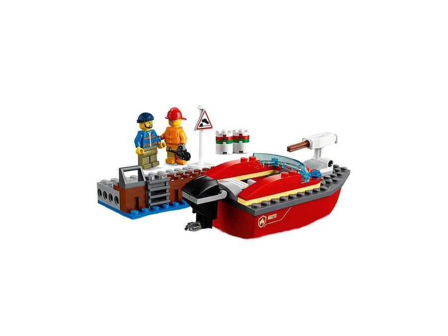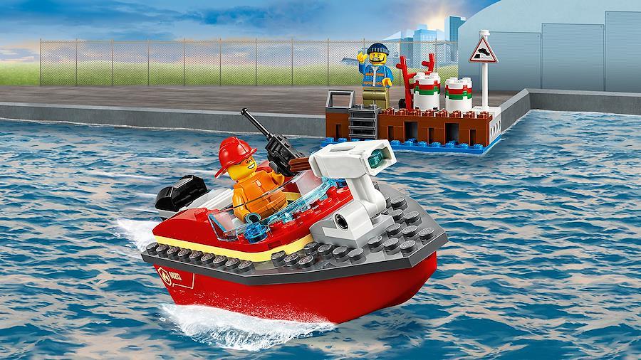 ヒーローレスキュー、出動! レゴシティ消防士に加わって港を保護しよう! 港で働いている人たちは忙しく働いていて、石油缶からでている煙に気がつかなかったみたいだ。たいへんだ、今火災が起きている! トランシーバーを使用して放水銃をもった消防艇を呼ぼう。それから、ボートが到着する前に、他の石油缶を安全な場所に動かしてくれ。いそげ! 港をまもれ!