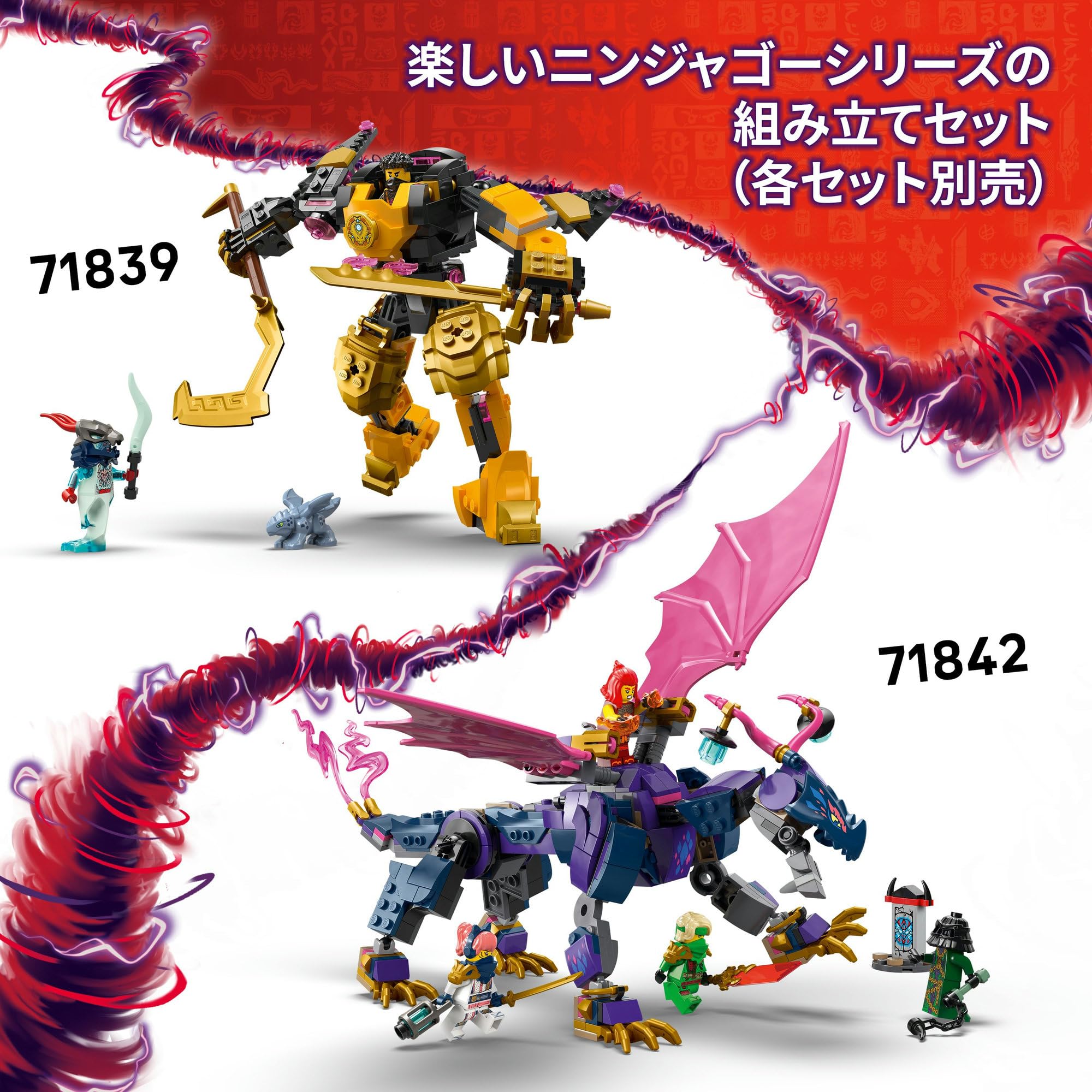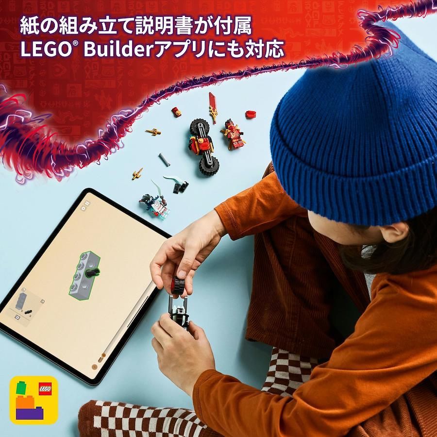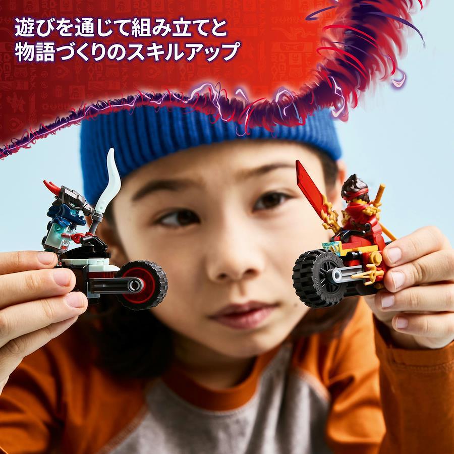 レゴ?ニンジャゴー カイのスピードバイクレース(71838)は、車輪が動くバイク2台で『ニンジャゴー ドラゴンライジング』シーズン3の興奮を追体験できる組み立てセットです。短剣2本が目印のカイのバイクと、まぼろしのドラゴニアンのデーモンバイクを組み立てて、熱いニンジャごっこを楽しめます。 それぞれのバイクには、ニンジャゴーキャラクターのミニフィギュアが付属しています。カイはクリスタルの剣の他にゴールドの剣2本、まぼろしのドラゴニアンは剣1本を装備し、空想の世界で激しいバトルを繰り広げます。お友だちといっしょにニンジャごっこをしてみましょう。 レゴ?ニンジャゴーシリーズには、ドラゴン、のりもの、道場をはじめ、お気に入りのヒーローと冒険ごっこを楽しめるセットが揃っています(各セット別売)。また、組み立て手順がひと目でわかるLEGO Builderアプリに対応し、お子さまと新世代の組み立て遊びをお楽しみいただけます。(ピース数:79)