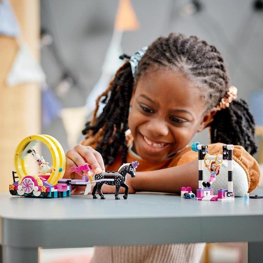 レゴフレンズ マジカルどきどきアクロバット(41686)があれば、お子さまはカーニバルの座長になりきって、マジカルなアクロバットを披露してくれます。カーニバルの衣装を身に付けたミニドール2体(オリビア、ステラ)、馬、フロート、吊り輪などのセットで、創造の世界にひらめきを与えるアクセサリーもいっぱいです。フロートを引くと回転するアクロバットのリングは、フロートから外して遊ぶこともできます。吊り輪は、専用のつまみで取り付けたミニドールを回転させることができます。カーニバルを夢見るお子さまのお誕生日のプレゼントやちょっとしたご褒美にぴったりです。(対象年齢:6才以上)フロートのサイズは、高さ約9cmx長さ約22cmx幅約6cmです。吊り輪のサイズは、高さ約8cmx長さ約7cmx幅約4cmです。レゴフレンズ マジカルシリーズのマジカルわくわくジェットコースター(41685)、マジカル・ショップ(41687)、マジカル・キャラバン(41688)、マジカルかんらん車とスライダー(41689)との相性もばっちりハートレイクシティシリーズは、リアルな設定の中で親近感を感じる思いやりにあふれたキャラクターたちが大活躍。お子さまは夢中になって遊びながら、友情の大切さを学びとっていきます。【免責事項】メーカーによる商品リニューアルに伴いパッケージ(内容量も含む)変更が行われた場合、新パッケージでお届け致します事ご了承願います。