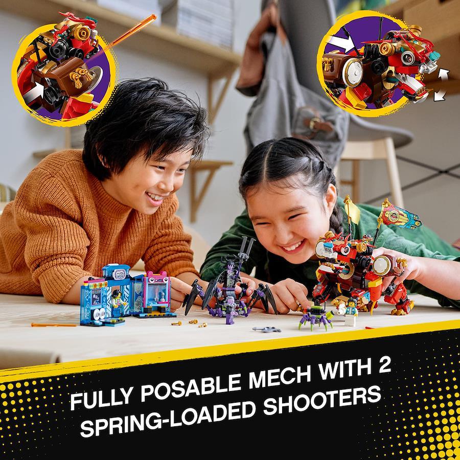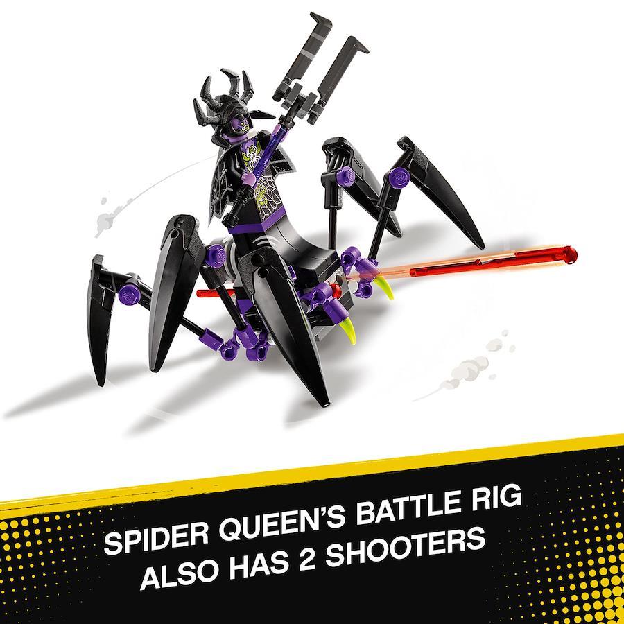 ライオン・ガーディアンは口を開け閉めでき、四肢も動きます。さらに、両肩にスプリングシューターが隠されています。スパイダークイーンの乗り物も脚が動き、スプリングシューター2台を搭載しています。