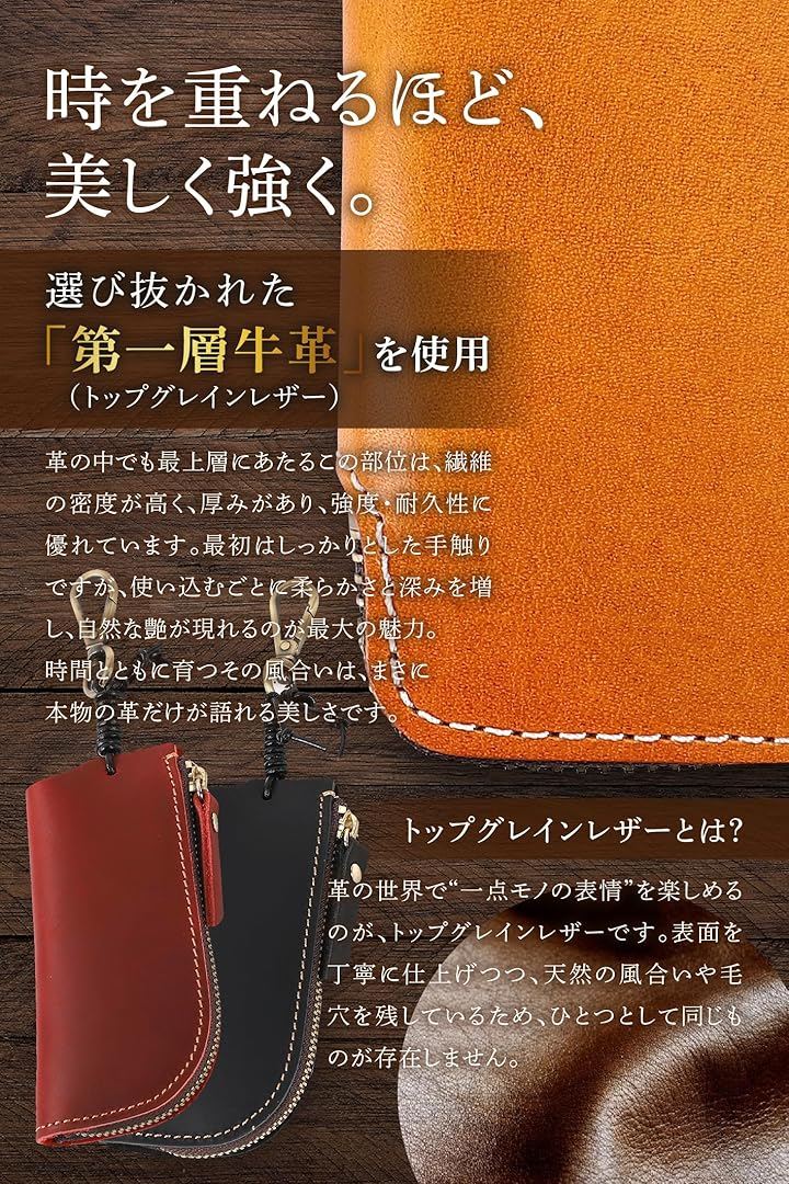 経年変化で艶が増し、使うほどに深みのある色合いへと育っていく“育てる革”です。