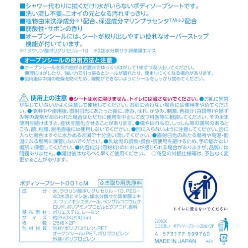 ●オープンシールには、シートが取り出しやすい便利なオーバーストップ機能が付いています。] 療養中や介護、キャンプや災害時などにも!シャワー代わりに拭くだけのボディソープシートです。 洗い流し不要。汚れをかき取るメッシュシートで、ニオイの元となる汚れすっきり。 植物由来の洗浄成分を配合。保湿成分のマリンプラセンタも配合しています。 約20×25cmのたっぷりサイズ。弱酸性。日本製。サボンの香りです。 オープンシールには、シートが取り出しやすい便利なオーバーストップ機能が付いています。