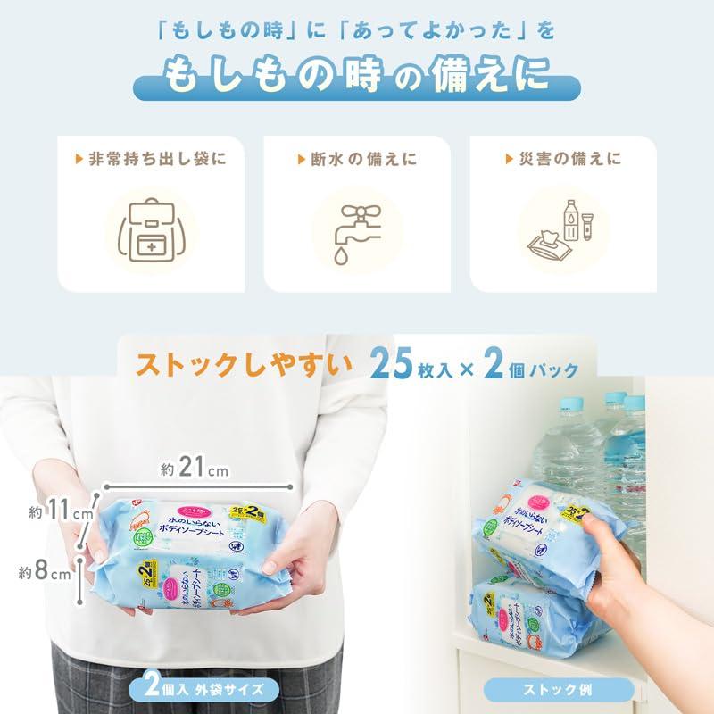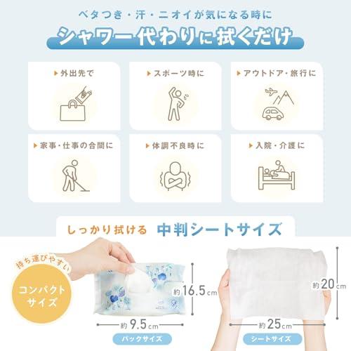 ●シャワーの代わりに拭くだけ!洗い流し不要の水がいらないボディーソープシートです。