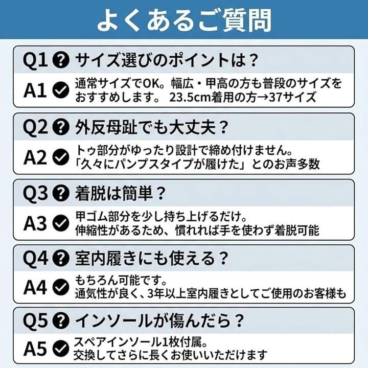 甲部分には伸縮性のあるゴムストラップを採用しており、足に合わせてフィットしながら脱ぎ履きがしやすい設計です。
