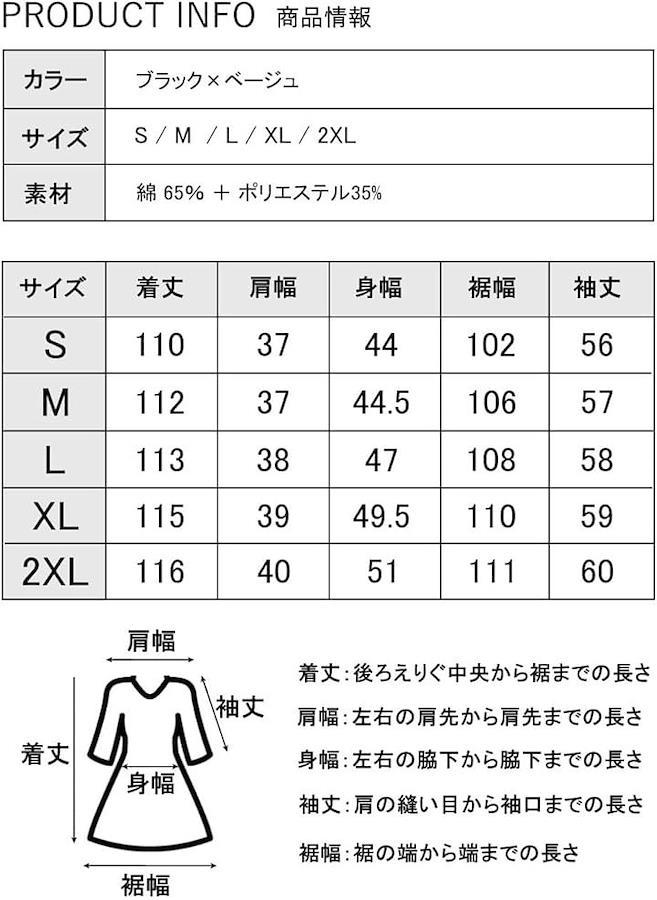 「サイズ」「S」着丈110 / 肩幅37 / 身幅44 / 裾幅102 / 袖丈56・「M」着丈112 / 肩幅37 / 身幅45.5 / 裾幅106 / 袖丈57 ・「L」着丈113 / 肩幅38 / 身幅47 / 裾幅108 / 袖丈58 ・「XL」着丈115 / 肩幅39 / 身幅49.5 / 裾幅110 / 袖丈59 ・「2XL」着丈116 / 肩幅40 / 身幅51 / 裾幅111 / 袖丈60 *サイズに多少の誤差がある場合がございます。