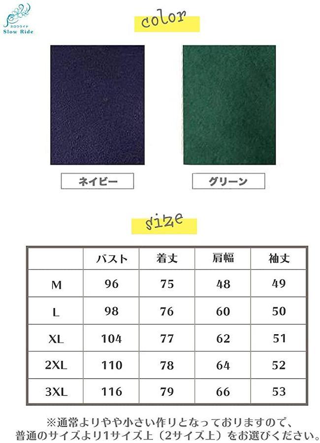 カラーはグリーン、ネイビーの2色、サイズはM、L、2L(XL)、3L(2XL、XXL)、4L(3XL、XXXL)までの5サイズ、10バリエーションからお選び頂けます。