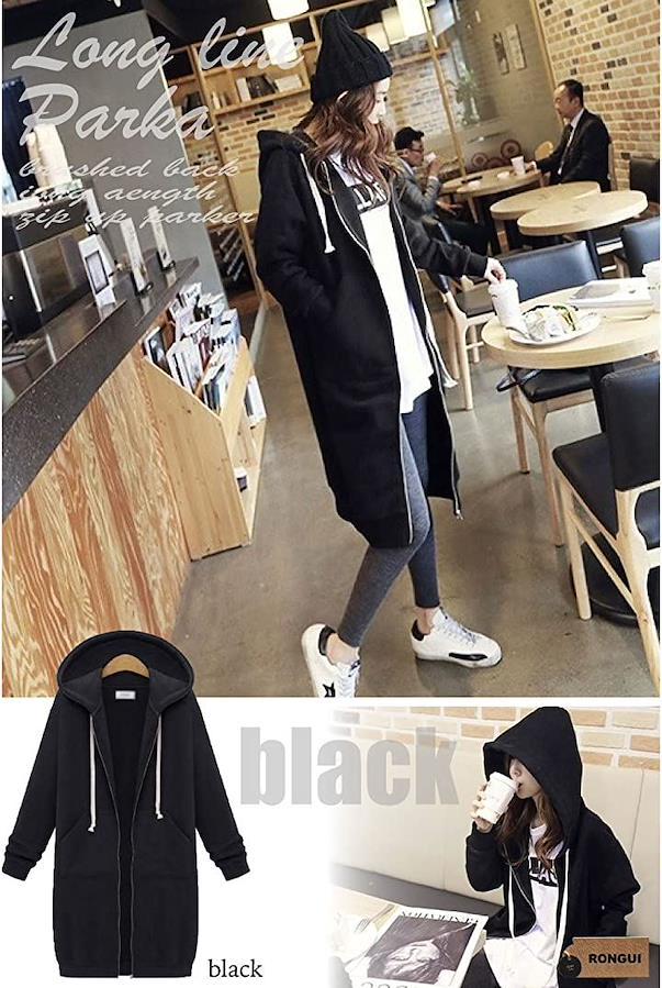 「ロング丈パーカー」長袖・無地でシンプルなデザインのロング丈レディースパーカー。