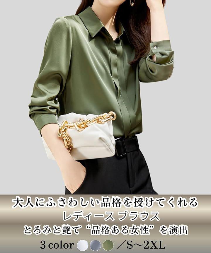 「大人にふさわしい品格を授けてくれるレディース ブラウス」とろみのある質感と上品な光沢感が魅力の長袖のシャツブラウスです。